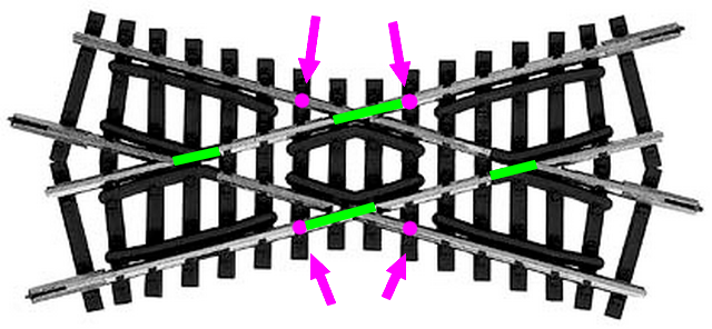 Při souhlasné polaritě (JK-JK) vedení kolejí do kříže musí běžně modeláři řešit přepínání srdcovek. Ve tvém případě protichůdného vedení polarity (JK-KJ) musíš přepínat polaritu vnějších kolejnic. Bez většího elektrického zásahu do kolejiště bude nejjednodušším řešením modul vratné smyčky. Ten bude napájet jen vnější kolejnice, zatímco srdcovky budou napájené přímo z tratě.
