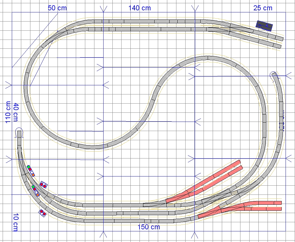 Ještě bych se zamyslel nad vytížením odbočné trati a doplnění nějaké vlečky buď ke koncové stanici. Nabízí se víceméně jen levý horní roh, nebo (a to je možná lepší) vlečku natáhnout dovnitř oblouku souběžně s tratí), ale pozor na přeplácání, aby zbylo místo na krajinu.