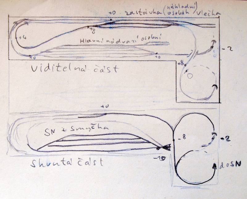 pravá vysunutá část by se využila převážně pro tobogán do kterého by se všechny tratě sjeli a kterým by se dostali pod úroveň viditejného nádraží kde by by bylo skryté nádraží (v místě pod hlavním viditelným nádražím) se smyčkou