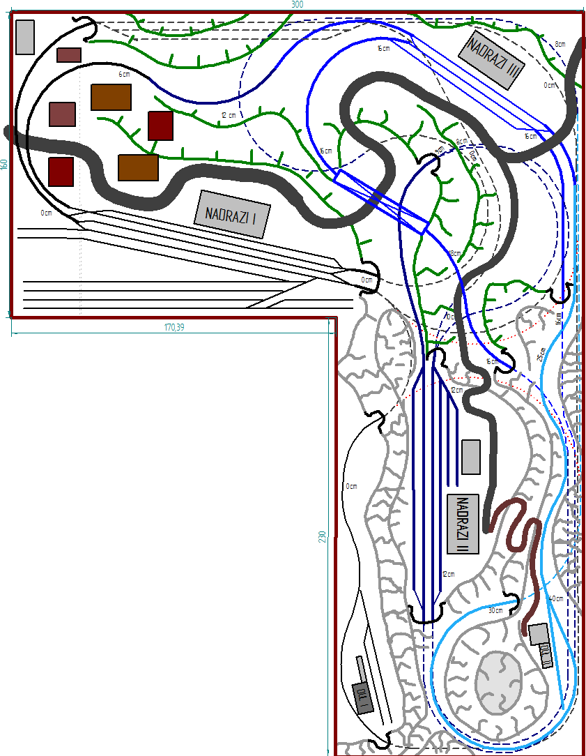 Na momentální návrh kolejiště jsem celkem hrdý, dokud mi ho tu nezkritizujete. Teď je totiž navrženo, tak že na kolejišti jsou 3 velké a zcela oddělené okruhy, přičemž by se dal ten jeden spodní ještě rozdělit na dva(červené čáry), ale bylo by to "z nádraží do nádraží". Má to vůbec smysl tam dávat výhybky? Návrh je snad srozumitelný-to silný je silnice a koleje nejníž=černě, stření výška=tm.modrá, vysoko=modrá a nejvýš=sv.modrá. Technicky je to možné realizovat, i když některá stoupání jsou celkem velká(v návrhu je třeba ještě něco posunout, na stoupání v návrhu moc nereagujte ;) ). Třeba to esíčko z nádraží 1 není uplně ideální, ale jinak se tam nevytočím. Jinak já se ve stoupání vyžívám, baví mě když se železnice táhne do kopce, i když mašiny to asi uplně moc nemusí-osobně ale nevím co by se jim mělo stát, táhnu 3 osobní vozy a jedu jednou za měsíc...