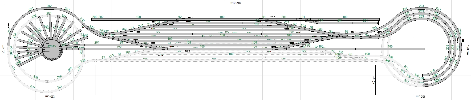 Depo ještě nenám rozmyšlené, stejně tak pravý segment nad tunely dvojkolejky. To co jsem měl, tak vycházely koleje šikmo od levého dolního kraje až k přípojné koleji od stanice.