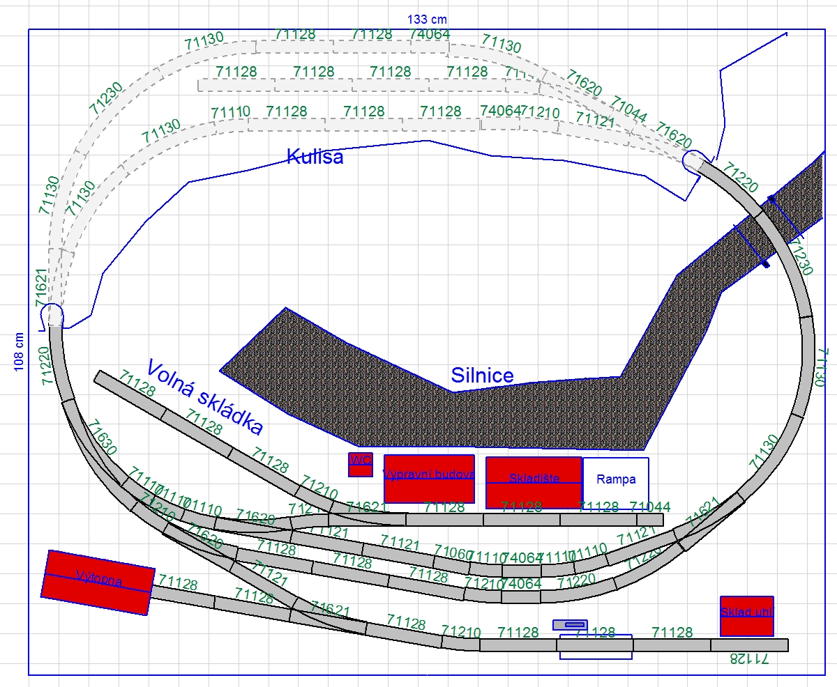 nesleduji to úplně od začátku, ale nebylo by lepší tu úvrať na manipulační koleji u budovy zjednodušit takto ? Silnici a budovy posunout dle situace a zleva doprava bude potom volná skládka, rampa se skladištěm, WC a budova ?