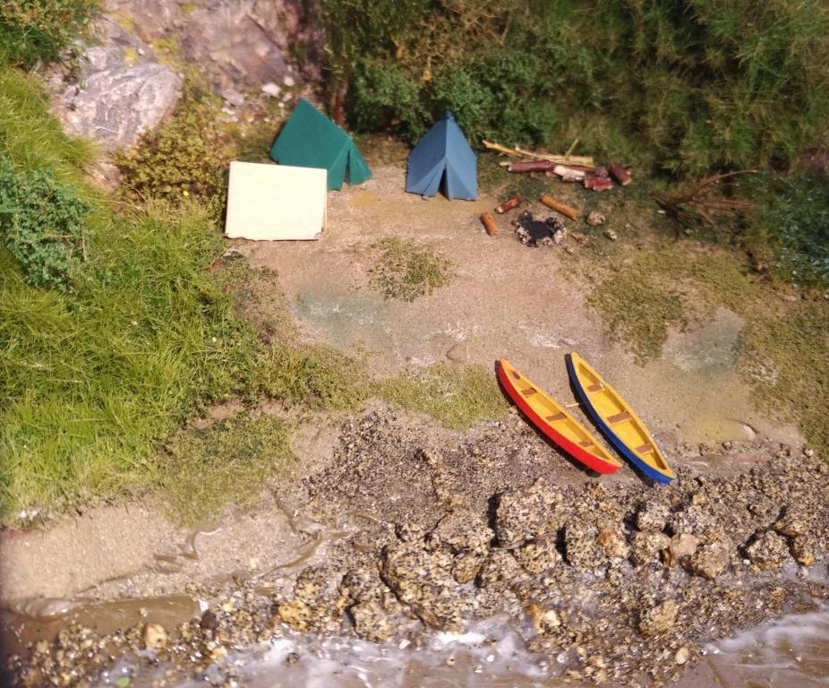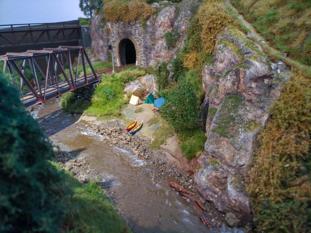 O víkendu jsem navzdory luxusnímu počasí nainstaloval tábořiště u mostu. Uživatel "Franky" mně laskavě poskytnul loďky a stany vytištěné na 3D tiskárně (ještě jednou velké poděkování). Chce to ještě dodat táborníky a nějaké detaily. Další level budou loďky plující na řece, ale na to musím vyzkoušet adaptovat nějaké figurky, jak to bude vypadat.