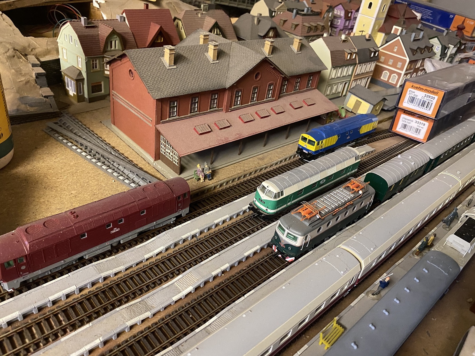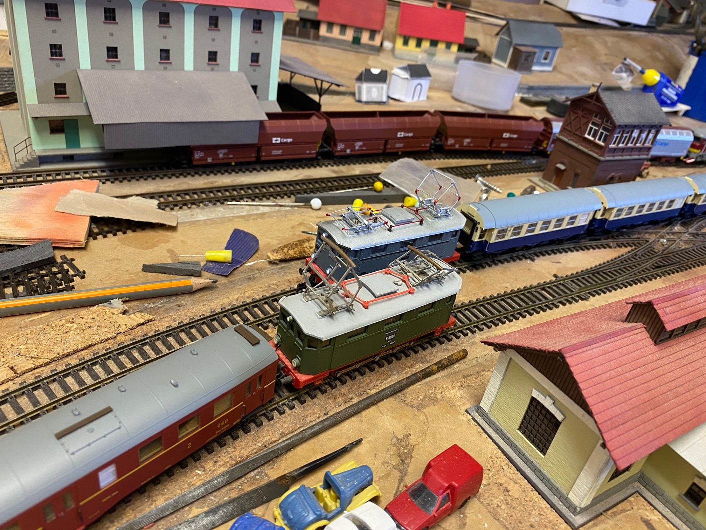 H0 lavičky a postavičky a kinder autíčka jsou hry dětí, to tam samozřejmě nepatří... A to jsem hned vozy zaprášil, hledal jsem nárazník a ofukoval. Našel.