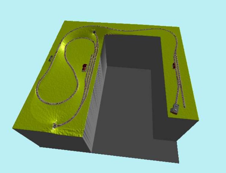 Na hlavním panelu odbočná stanice,v rovině 0mm, odtud vedou koleje do skrytého nádraží (označeno žlutě), které je v úrovni -50 mm a je přístupné ze zadní části kolejiště. Dále odbočka na lokálku se zastávkou a koncovým nádražím v ůrovni +100 mm.