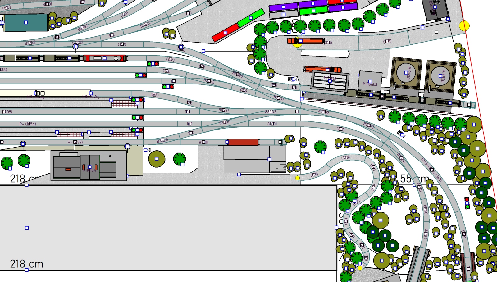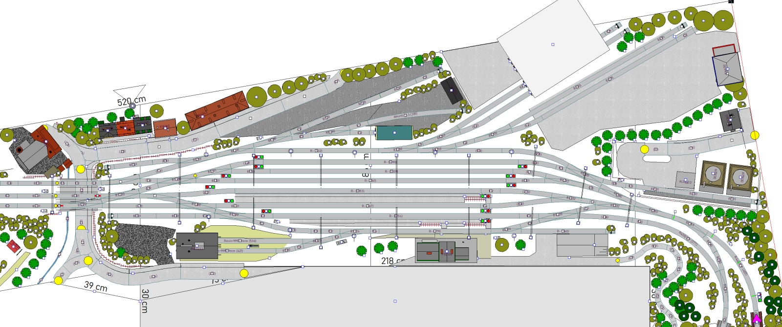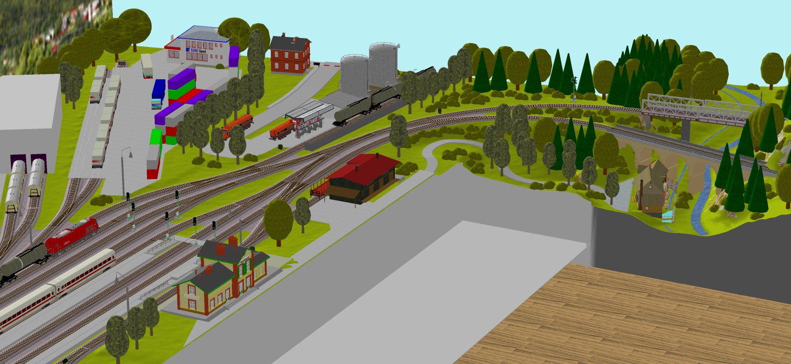 2) A s tím souvisí úprava na pravém zhlaví - když už jsem to posunoval, dostal jsem se vpravo moc ke kraji kolejiště, oblouk před stanicí začal být nepříjemně utažený. Tak mne napadlo to zakroutit jinde a Angličana nahradit dvěma výhybkami - výsledkem je dle mého mnohem přirozenější tvar zhlaví, navíc snáze sjízdný. Sice se zkrátila délka širé tratě, ale ty dvě vytažené výhybky se dají rozumně "zazelenit" tak, že divák ani nepozná, kde vlastně stanice končí a tak vizuální dojem zůstane snad stále dobrý.