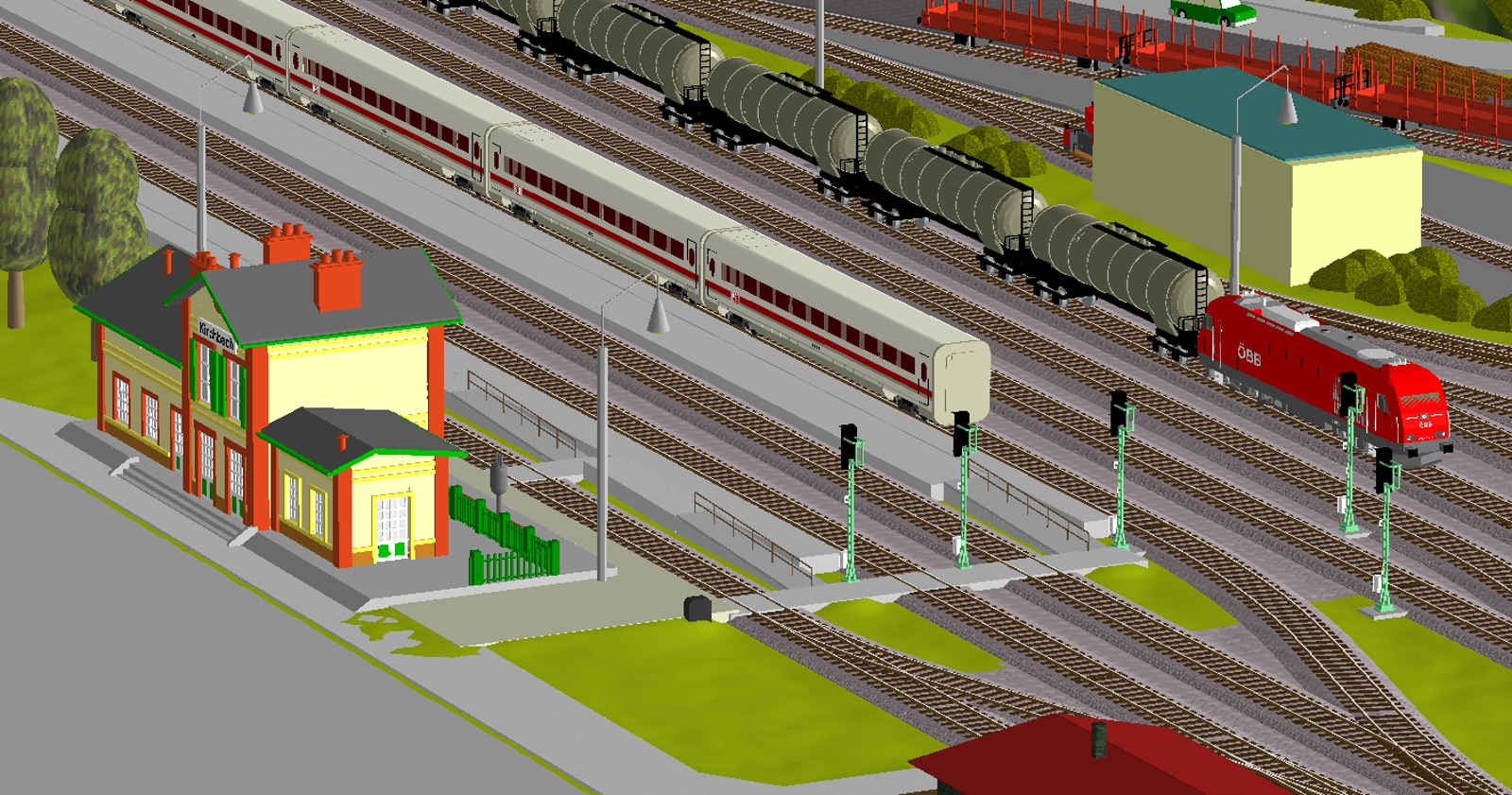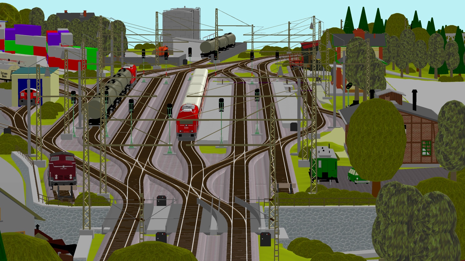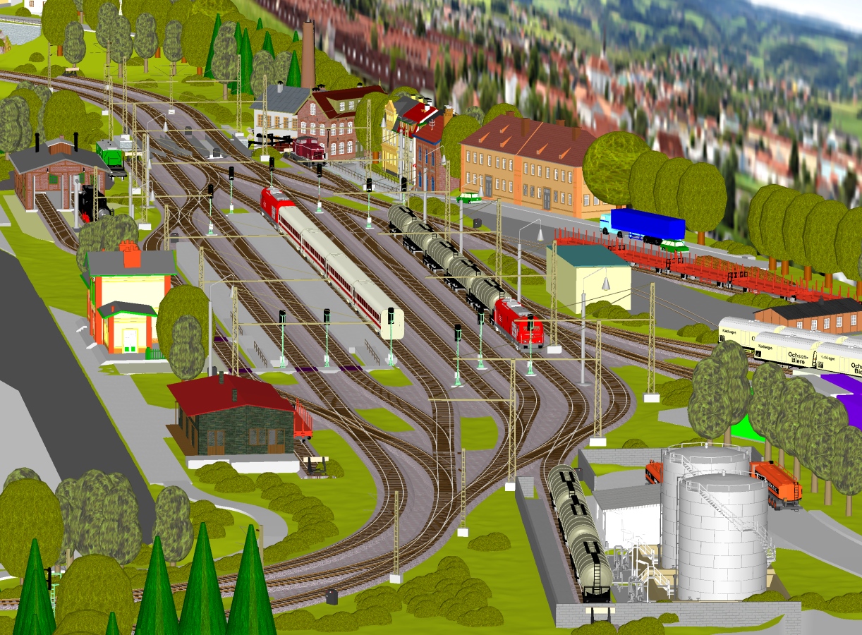 2) A s tím souvisí úprava na pravém zhlaví - když už jsem to posunoval, dostal jsem se vpravo moc ke kraji kolejiště, oblouk před stanicí začal být nepříjemně utažený. Tak mne napadlo to zakroutit jinde a Angličana nahradit dvěma výhybkami - výsledkem je dle mého mnohem přirozenější tvar zhlaví, navíc snáze sjízdný. Sice se zkrátila délka širé tratě, ale ty dvě vytažené výhybky se dají rozumně "zazelenit" tak, že divák ani nepozná, kde vlastně stanice končí a tak vizuální dojem zůstane snad stále dobrý.