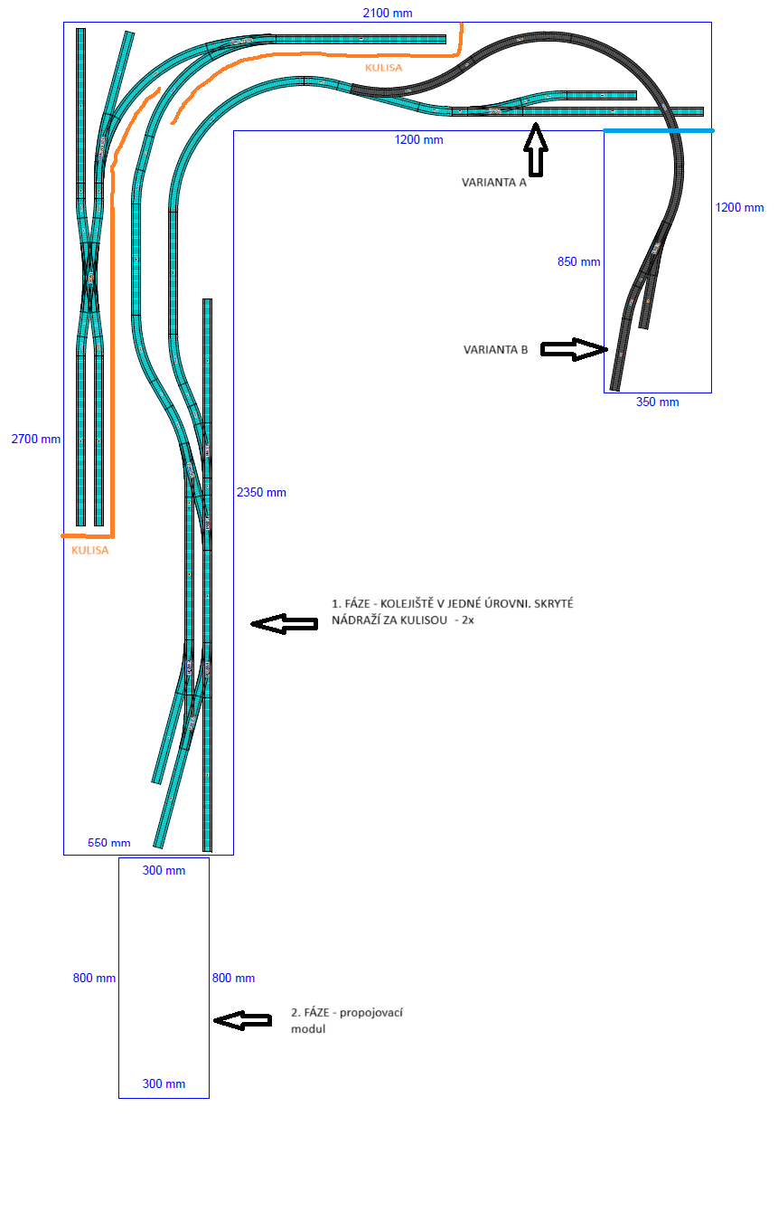 V této části nepočítám se skrytým nádražím v nižší úrovni. Toto kolejiště bude realizováno v 1. fázi a bude doplněno kolejištěm, které budu v budoucnu dále realizováno ve 2. fázi v rozměru dle přiloženého plánu prostoru.