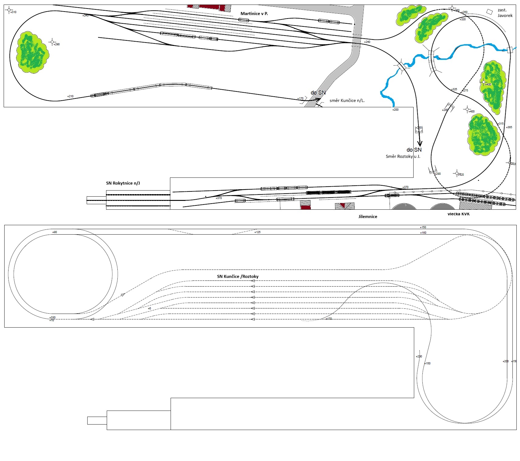 Pro upřesnění jsem doplnil přibližné výškové vedení tratí - kóty začínající + jako výchozí rovina je zvolena skrytá stanice s kótou +0.