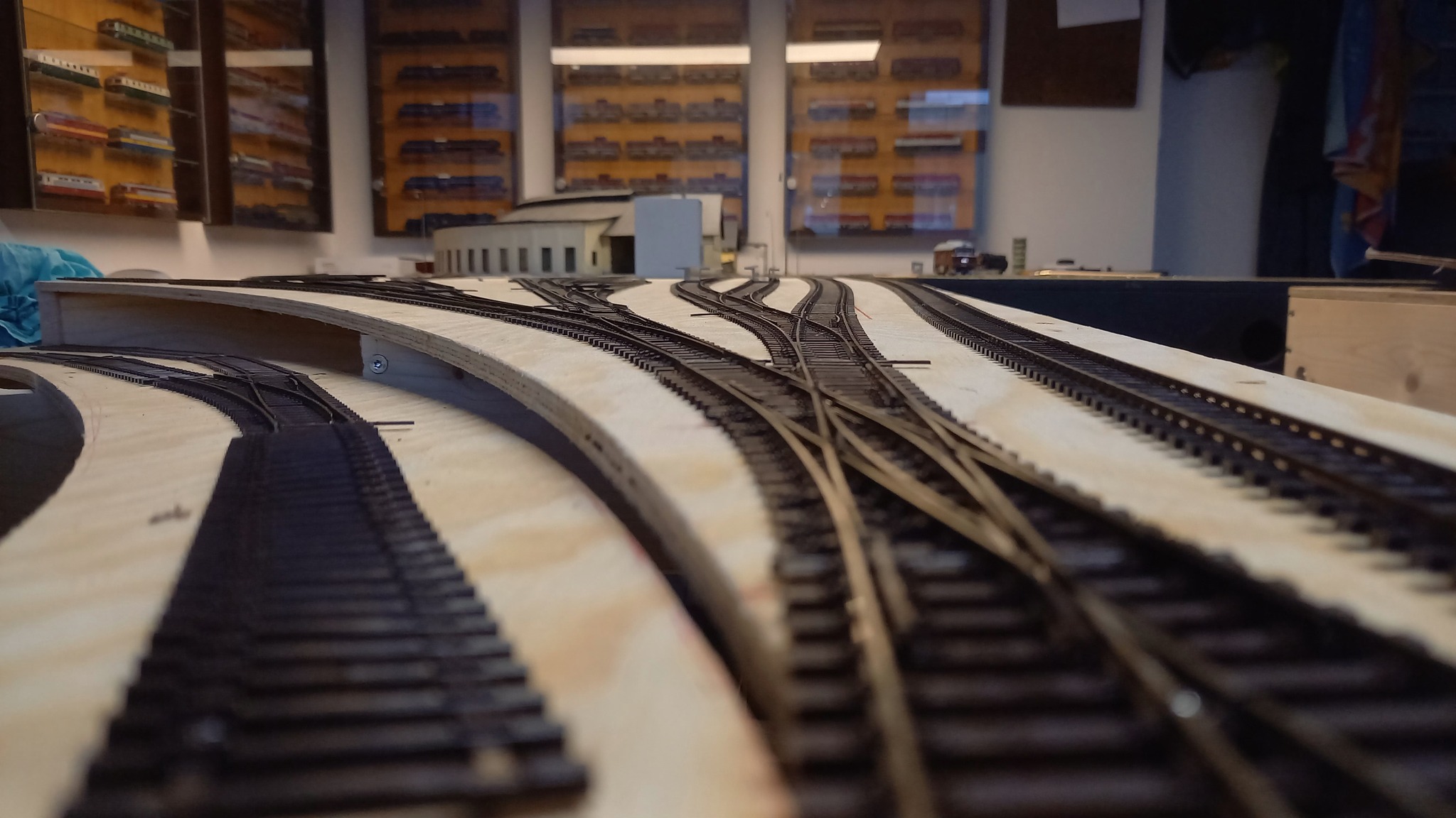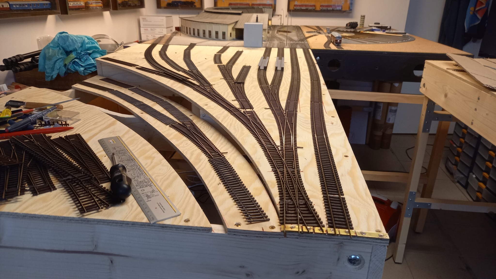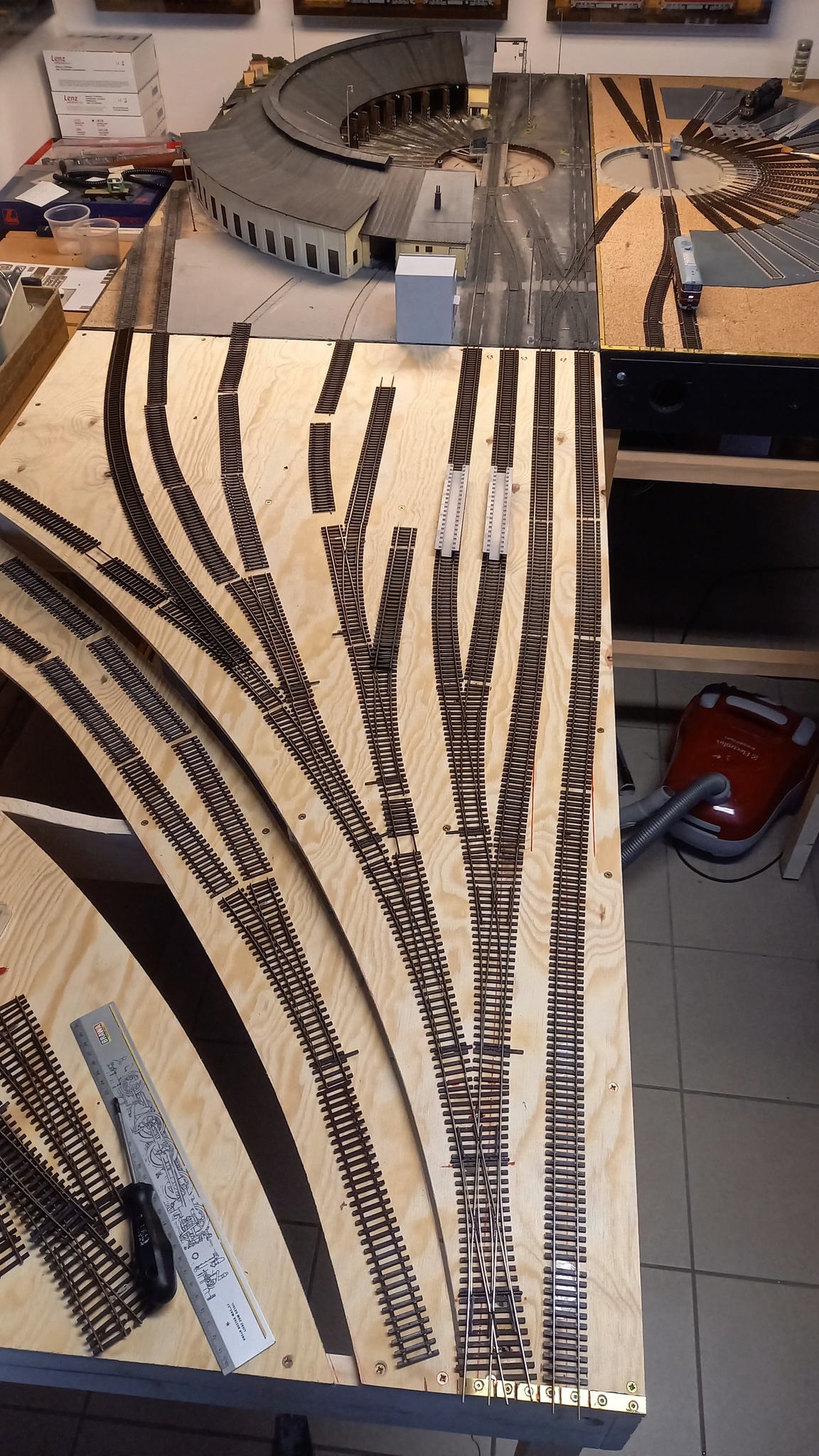Práce na depu pokročily. Mám hotové rámy pro další dva moduly. Pokládám koleje v rozvětvení zhlaví před severní rotundou. Tyto moduly mají spád směrem ke stanici cca 2 cm jako ve skutečnosti.