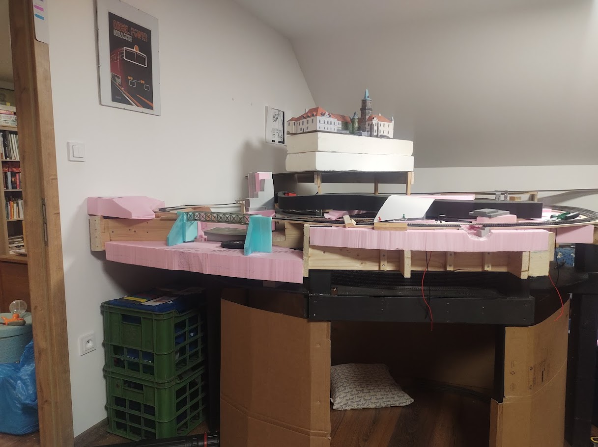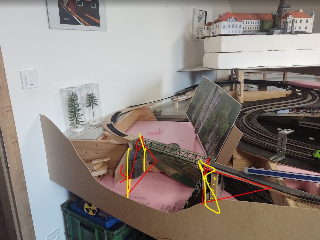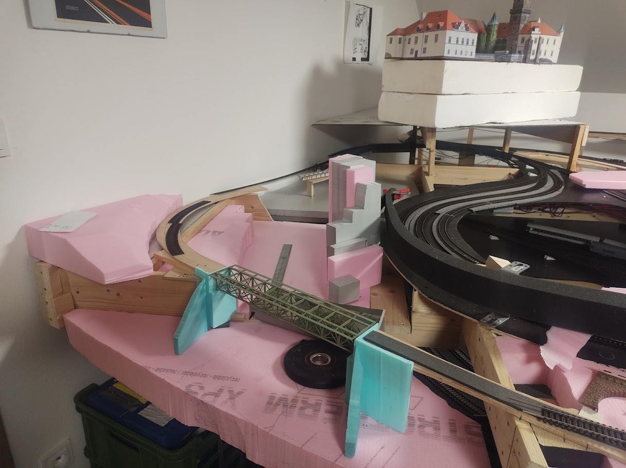 Hráz rybníka bude doufám ten kus šedého styroduru a ne rovnoběžně s mostem jak je na plánku dříve? Kdyby to bylo rovnoběžné asi by to nevypadalo moc přirozeně...