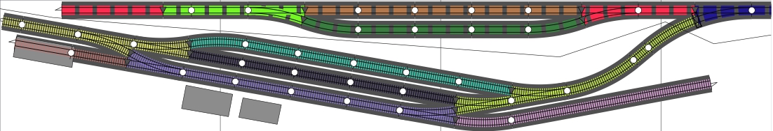 Díky, to vypadá na správný směr! Ještě bych tam chtěl mít krátkou kolej na odstavení lokomotivy / remízu, zkusil jsem ji zabudovat a prodloužit vlečku. Nákladiště spíš ne. Z hlediska provozu by bylo super, ale každá výhybka na už tak krátké trati ji „rozbíjí“ na dva kusy. Ještě jsem zvažoval vestavět rozvětvení už do výjezdu z oválu a na novém segmentu mít úplně skrytou kolej, navazující jen na ovál. Jsou s tím ale spojené 2 problémy: potřeba velmi úzkého tunelového portálu (ve tvaru obráceného U nebo dokonce hranatého) a posunutí kolejí dopředu – tím zbude užší prostor na staniční budovu. Tu už mám postavenou, má rozměry zhruba 11x6,5 cm. Malý sklad by k ní asi přistavět šel.