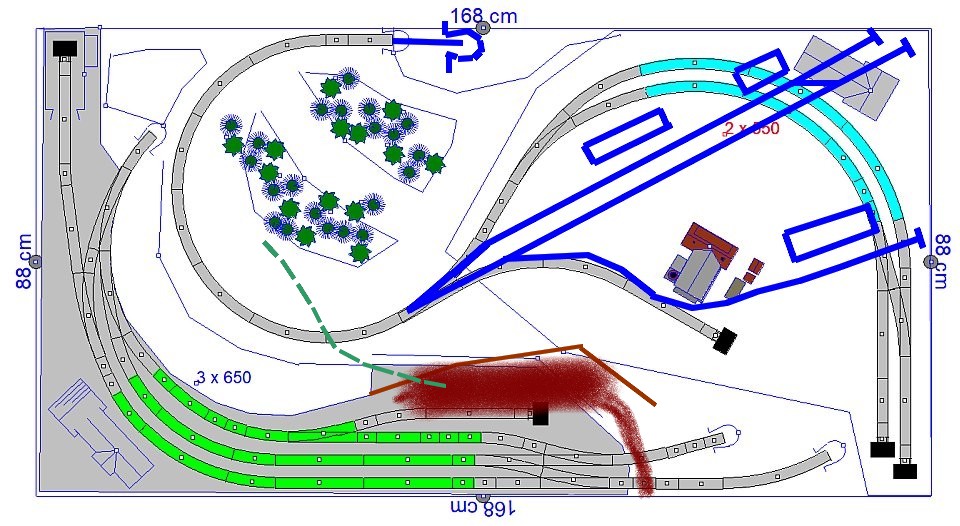 K rozměrům desky: Platí to, co je v názvu, modifikace rozměrů je možné udělat, protože kolejiště bude koncem srpna (snad) přesunuto do vyklizené místnosti, ve které nejdříve bude uprostřed "sedět" na stole, a poté bude nějakým způsobem uschováno u zdi, kde bude je značná rezerva. Nejsem tedy momentálně limitován přesně daným rozměrem místnosti/prostoru, ale spíše nejistou budoucností. V mém zájmu je se jakýmkoliv permanentním rozšířením vyhnout, a ulehčit tak stavbu. Přídavným, pro provoz ne tak potřebným, segmentům se nebráním, ale je to spíše otázka toho, kam mě život zavane, což vy, zkušení stavitelé, určitě víte.