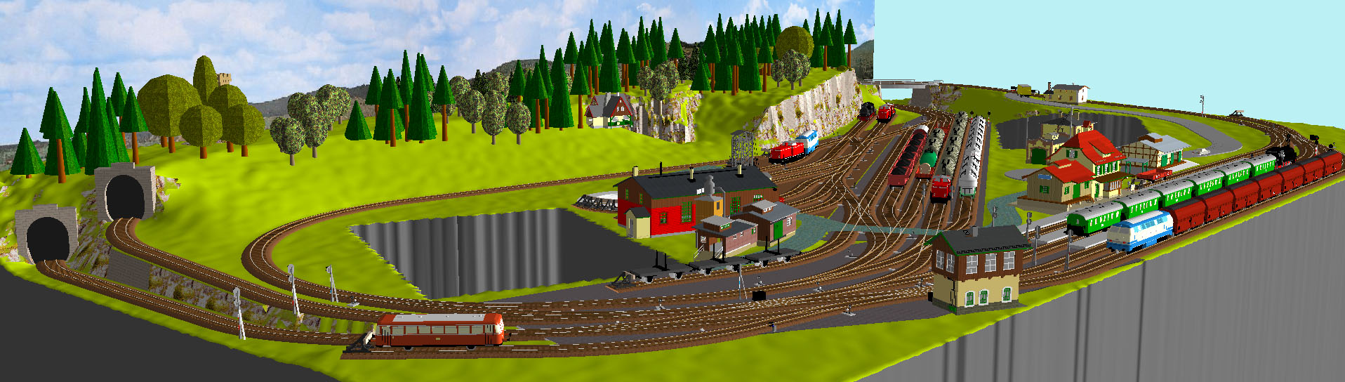 Okruh: taky někde tady, jsem se dočetl, že dívat se jak jezdí vláčky dokolečka, chvíli baví děti tak do 5 let. U mně je to o provozu v nádraží. Posuny, sestavování vlaků, provoz v depu. Okruh je jen proto, aby odněkud ty vlaky přijely a někam jely. Jen do zadního skrytého, aby z opačné strany vyjel jiný. To samé se spodním skrytým. Vozový park mám dost velký, proto tolik kolejí dole. Plánuji taky nějaké automatické průjezdy přes osobní nádraží (se zastavením), zatímco si budu posunovat na nákladním.