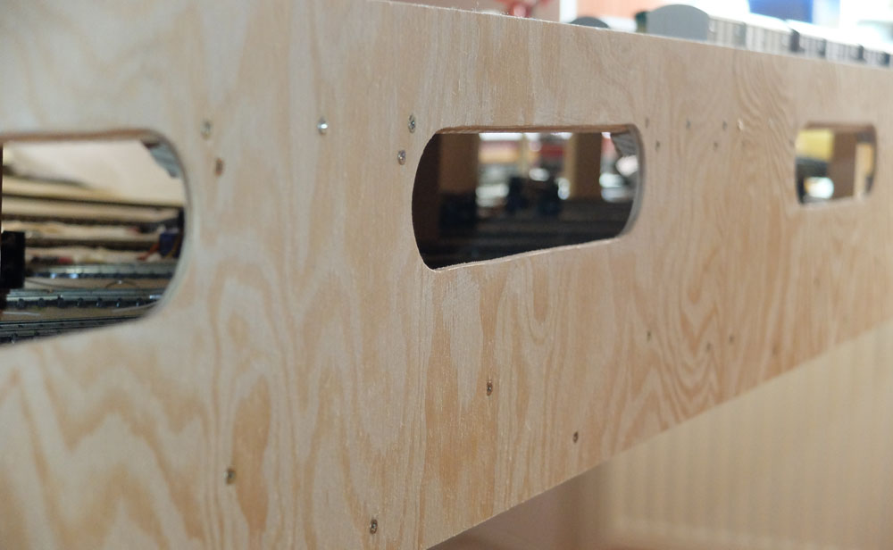 Rám: protože je celé kolejiště zavěšeno na čtyřech horolezeckých lanech u stropu, je rám celistvý. Uvnitř smrkové latě 48x24mm, různě prokládané. Nahoře 8mm překližka zespodu 4mm. Slepeno sešroubováno. Celková výška 6cm. Rám je tuhý, pevný, nijak se neprohýbá. Zavěšeno ne na krajích, ale ve středních částech. Ten seříznutý roh je aby se dalo lépe projít. Místnost je 4,5x3m. Kolejiště 3x1,75m. A když je kolejiště u stropu, je to normální pokoj. Těch lan je ve skutečnosti 8. Další 4 jsou na protizávaží.