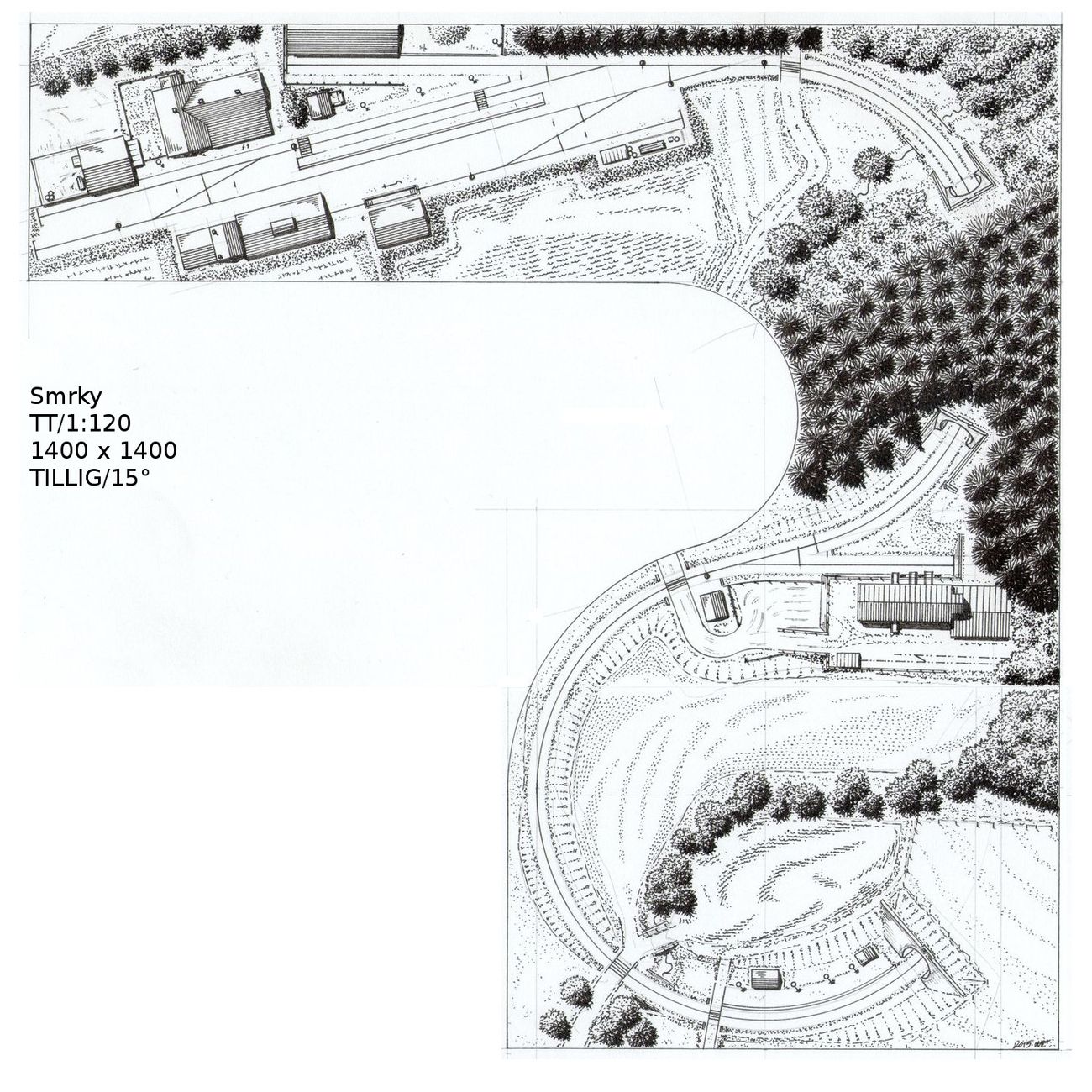 Kolejiště Smrky je v rovině. V tunelu pod lesem je pravá výhybka, rovně vede k tunelu u zastávky. Jestli se pod louku vlezla i odbočná skrytá kolej, si nevzpomínám, ale já bych ji tam dal, aspoň na vykřižování krátkého motoráku.