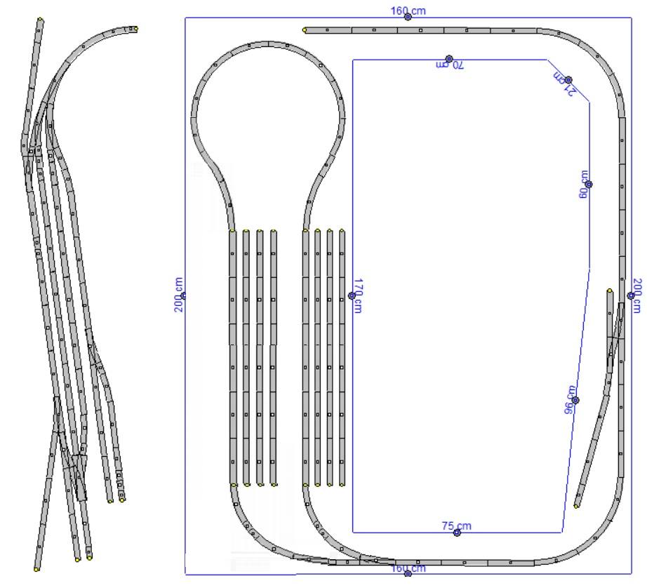 Další pokus u plánování. Místo druhé koncové stanice je jen obyčejná trať, na které je zastávka s odbočkou na vlečku, kterou jsem viděl v létě na trati z Kralup n. Vltavou. Spodní část vede po mostě a segment by měl být vyjímatelný, abych nemusel podlézat. Pak skryté se smyčkou a přesuvnou, abych ušetřil za výhybky.