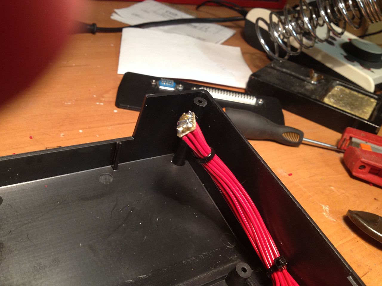 Je to malý čtvereček předvrtaného jednostranného plošného spoje, ke kterému jsem pak heftl tlustý vodič a ten přivedl jakožto společný pro jeden a druhý obvod každý na pět kontaktů CANONU, aby se rozložila proudová zátěž. Jednotlivé signály pak jdou po jednotlivých žílách mezi CANONY.