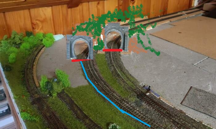 Zkrátit zhlaví, použít křížení, místo výhybky za sebou. Stejný poloměr oblouku, jen posunout blíže a portál taky posunout.