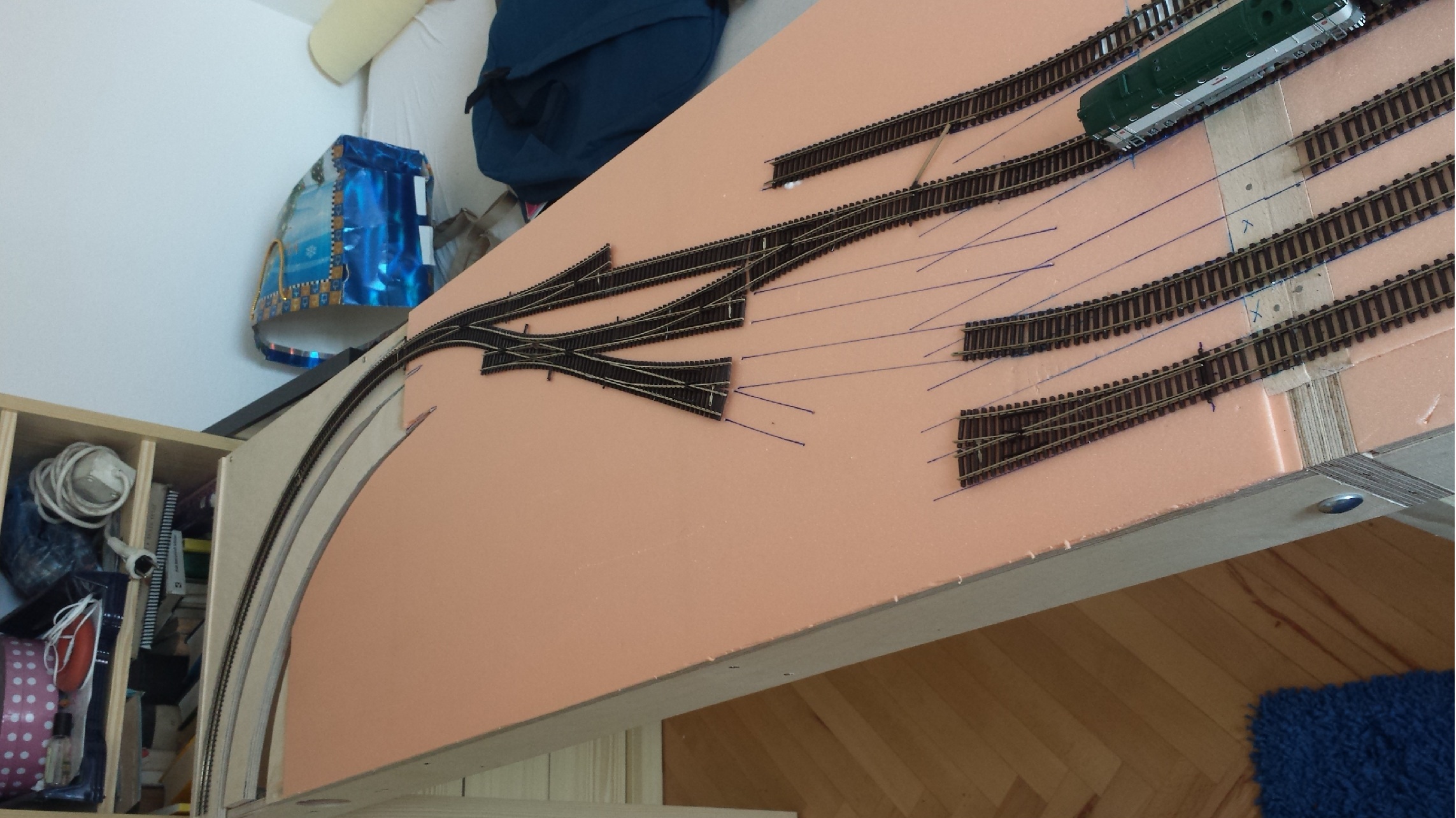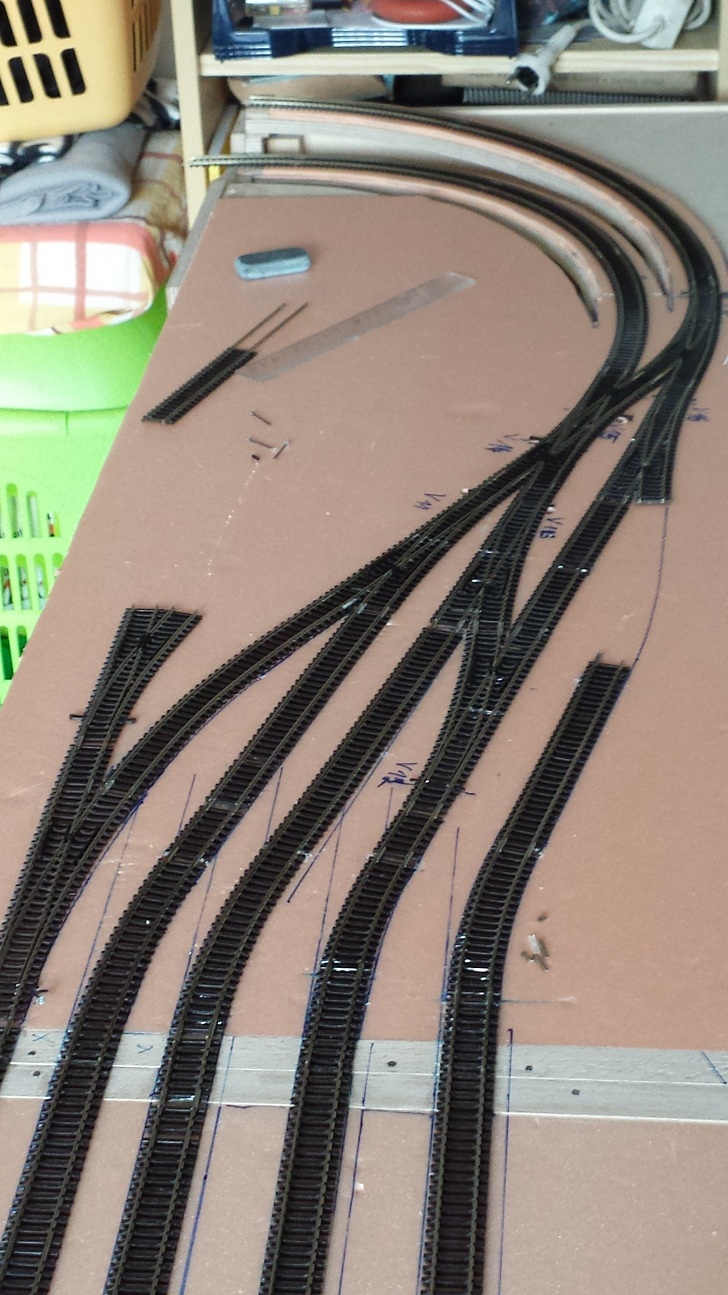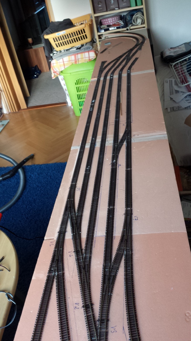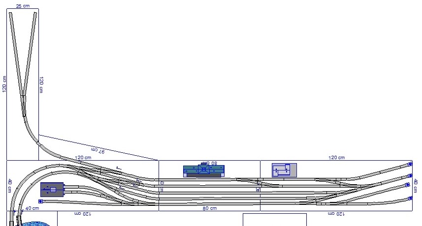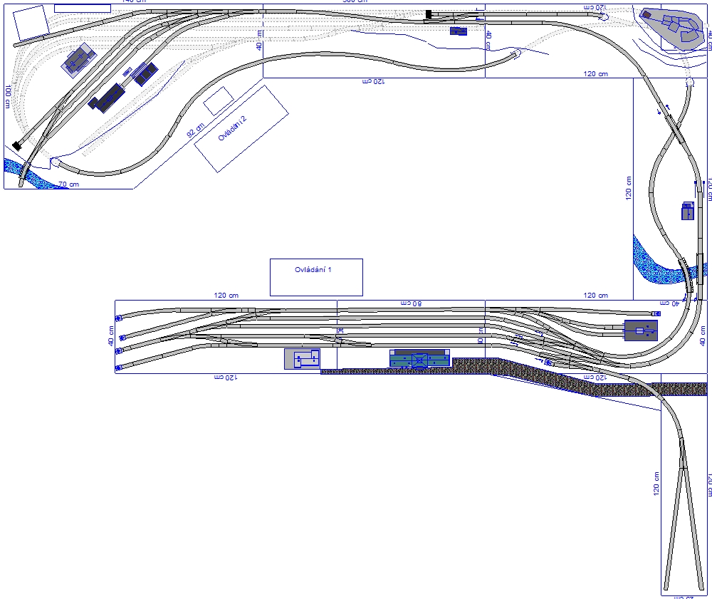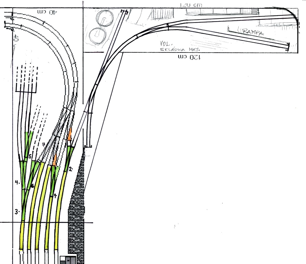 Přesně tak - dát to na kulisu. Co se týká toho odvratu tak by mohl být až na to trojůhelníku. Hlavně doporučuji se zabývat dodatečně těmi směrovými poměry ve stanici - jsou tam uplně zbytečně prudké poloměry mezi zhlavím a tou rovnou částí stanice. Na těch fotkách to vylezlo... Doporučuju to začít kroutit pěkný tahlým obloučkem už na to prostředním segmentu - odhaduji cca R 1500-1800 někde cca 20cm od hrany rozhraní a koleje říznout mirně pod úhlem. Také alespoň místo vyhýbky č. 1 bych dal asi symetrickou, ty esíčka pak nebudiu tak prudké. Pokročilejší úpravy by mohly spočívat - narovnání odbočné větve vyhýbek - oranžově - pak se oprovídajícím způsobem opraví i příslušné přilehlé. Tak nějak od ruky jsem to nasnačil do původního plánku. Pak jsem tam naznačil i změněné umístění remízy, na původním to vychází taky moc zakroucené koleje a roh docela blízko toho oblouku tratě. Ta kusá kolej jsou jen varianty - buď vyhýbka 5 nebo 6.Rocky_MK píše:Zaústění OK, ale to rozvětvení je zlé. Vždyť takto na ten segment nemůžeš žádný průmysl apod. rozumně postavit, leda by ho bylo 90 % na kulise.