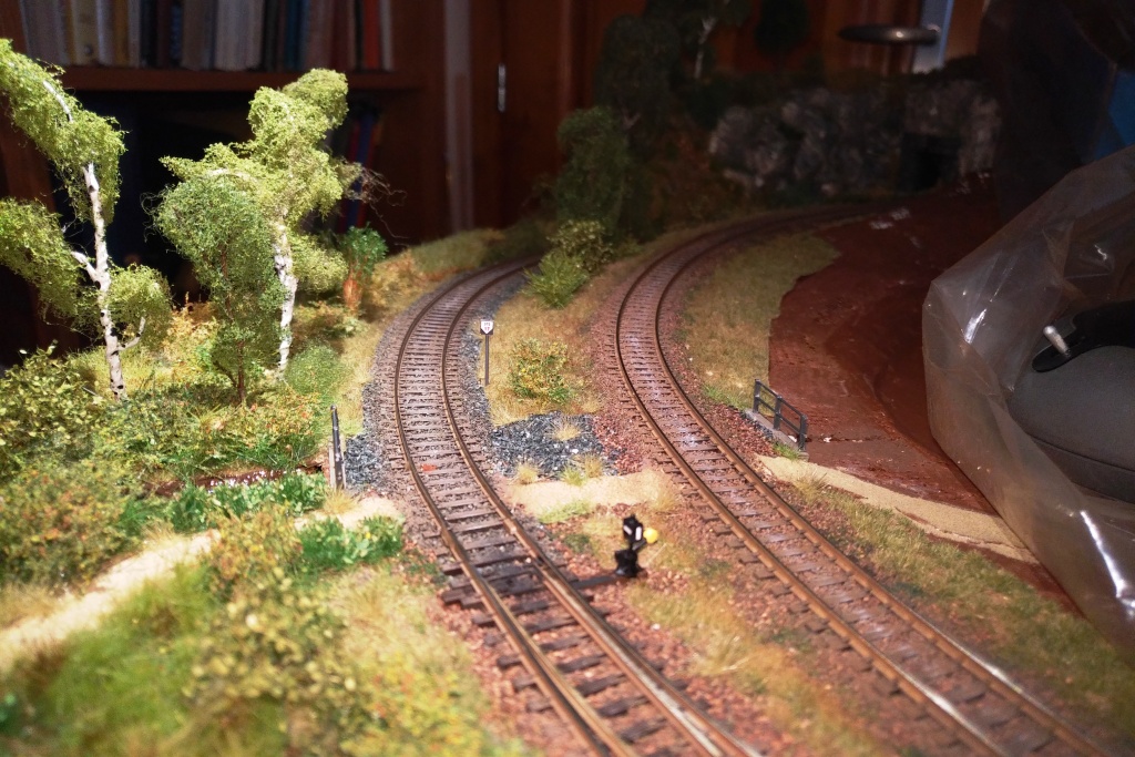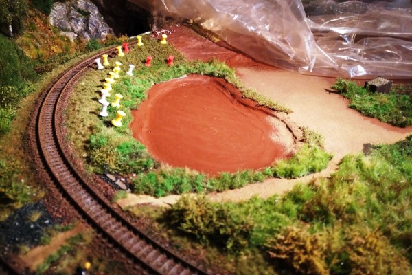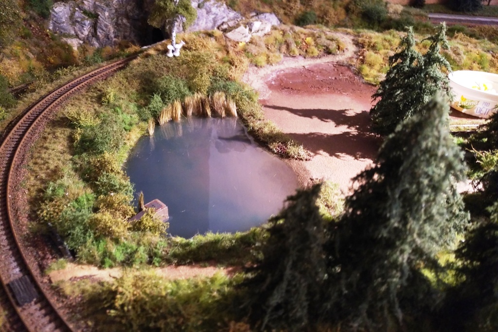 Před litím "vody" ještě dno nastříknu akrylkami (nějakou rybniční hnědo - zelenkavou). Voda bude Woodland Scenics Realistic Water C1211. Je to jednosložková hustá kapalina, údajně s malou smrštivostí, ale protože jsem s tím už udělal řeku, tak bych to tipnul nejméně na -20%. Pro vrstvu 3 - 5 mm budu muset lít nadvakrát. A samozřejmě hodně to vzlíná. Proto jsem nechal kraje bez pokryvu - dodělá se příroda až potom.