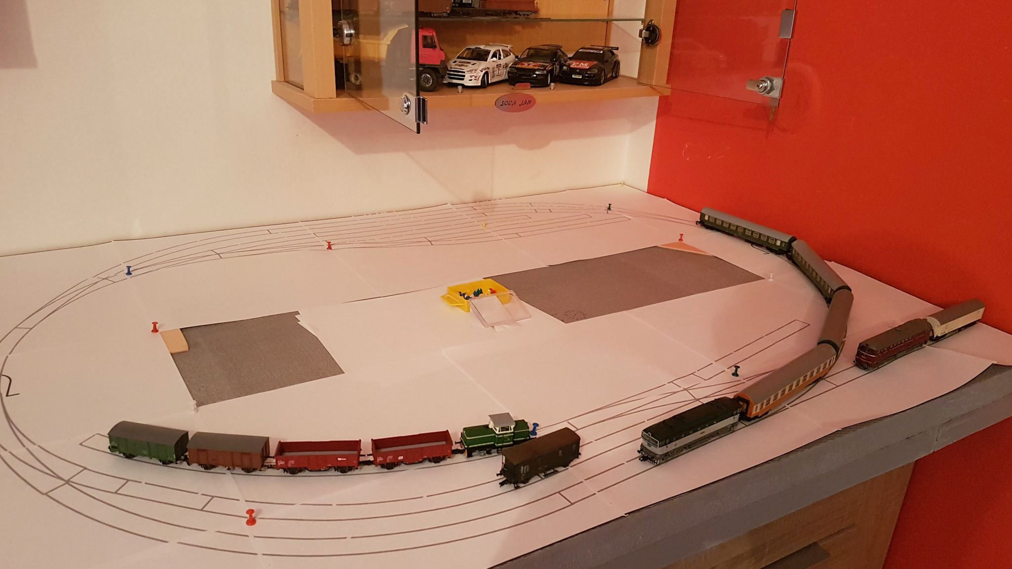 Tak abyste neřekli, že jen plácám na fóru. Vytiskl jsem si plánek a rozložil na desce. Zkusil jsem, jak by vypadal v oblouku rychlík (ten oblouk má nakonec větší poloměr).