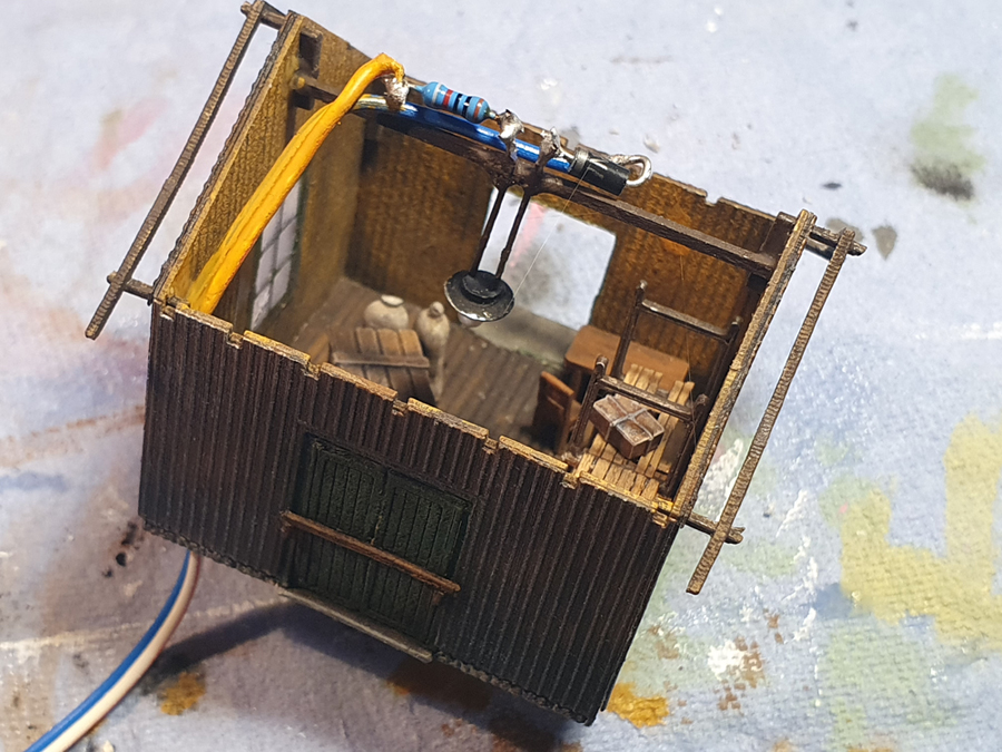 Světlo je udělané z LED diody pr. 3 mm, která je zalepená v lehce promáčknuté podložce M3. Povrch diody je zmatněn šmirglem, pod střechou je to doplněné odporem a diodou - viz foto níže (omlouvám se za nekvalitní foto diody uvnitř skladu, lépe se mi to fakt nepodařilo). Není to můj vynález, pokud si dobře pamatuju, tak tohle vymyslel kdysi Houmr. Na TT je to trochu velké, ale dovnitř není moc vidět. Určitě lepší řešení se nabízí zde https://jmdetail.com/domains/jmdetail.com/index.php?route=product/product&path=301_306&product_id=192, což plánuji použít na pile, tam to bude více na očích.
