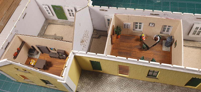 No, dá to sice rozum, ale samozřejmě jsem na to zapomněl. Kartonové stěny místností prosvítat určitě nebudou, doufejme, že ani přední stěna (ta má na sobě několik vrstev barev, takže to bude snad ok) a snad obstojí i stropy místností. Ty jsou ze slabšího kartónu, ale zase jsou pod střechou ... teď už se ale můžu jen pomodlit.