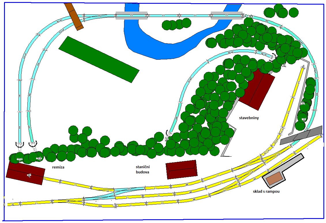 co zkusit dát staniční budovu (a vedle ní sklad) do volného rohu. Ušetříš místo ve středu kolejiště (nad tunelovým portálem. Přejezd povede pouze do stavebnin. Proč se bráníš více dopravním kolejím. Do stanice Tio vedou dvě trati, dá se čekat,, že tam přijede víc vlaků. V příloze je upravený poslední plánek. uU čárkované koleje můžeš mít plochu pro vykládku či nakládku (tyicky dřevo, zeměndělské produkty.) Kolej u výpravní budovy je manipulační, zbylé dvě dopravní.