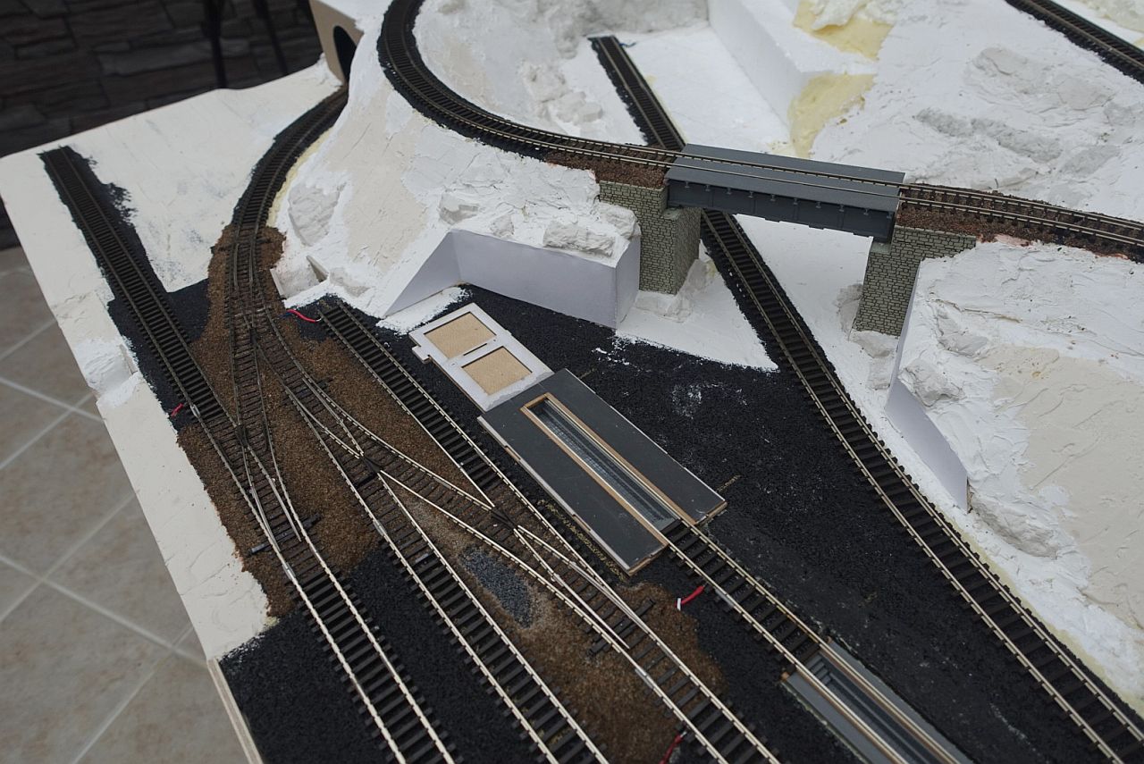 Každopádně by měl nyní dotvarovat terén. Tedy ještě předtím sehnat, postavit a nainstalovat objekt drtiče v kamenolomu. Protože teprve od toho se bude odvíjet položení těžebních kolejí a vjezdů do hory. Po dokončení terénu by se měly dolepit opěrné zdi a k nim dodělat skály. Pak bych vše napustil penetrací, nabarvil zdivo, skály a zahlinil spolu s doštěrkováním a hliněním nádraží a vlečky, kde je to ale zase vázáno na instalované budovy.