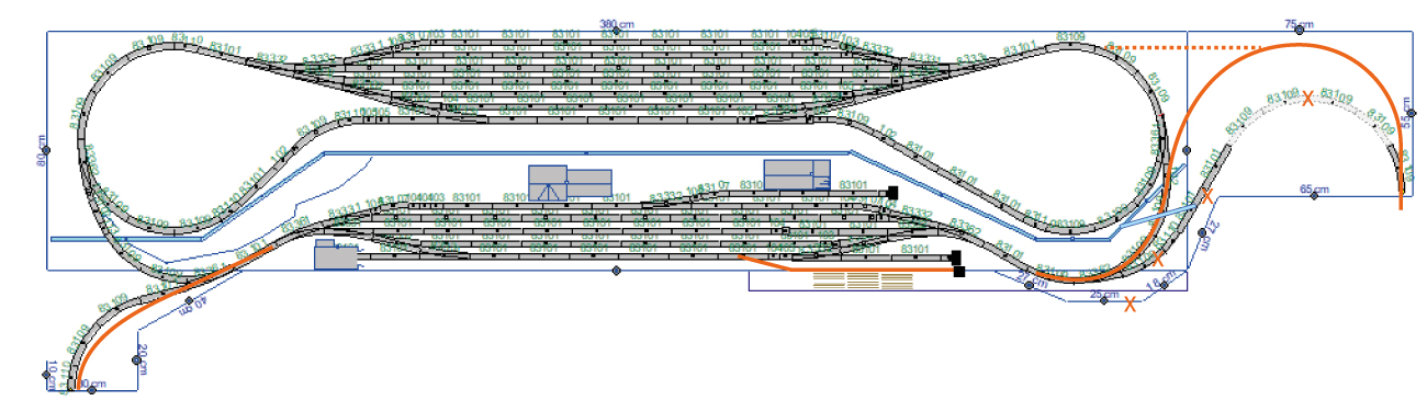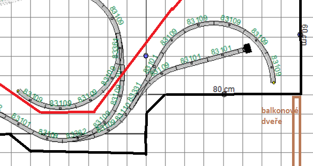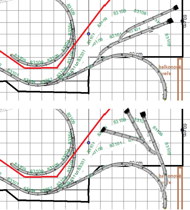 (skryté propojení vpravo z oranžové koleje do SN by se mohlo po vystavení trati kolem pokoje deaktivovat - a výhybky použít jinde)