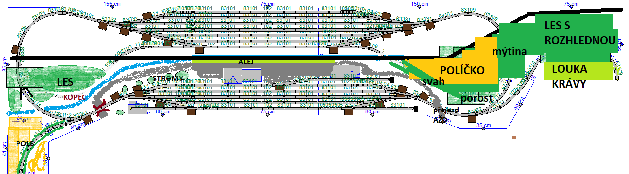 Kulisa: možná by bylo dobré udělat kulisu jako vydělávací pozadí cca přes půlku kolejiště po celé délce a tam, kde trčí oblouky smyčky, tak udělat kopec (třeba i oddělávací), možná by to bylo estetičtější než xkrát lámající se pozadí.