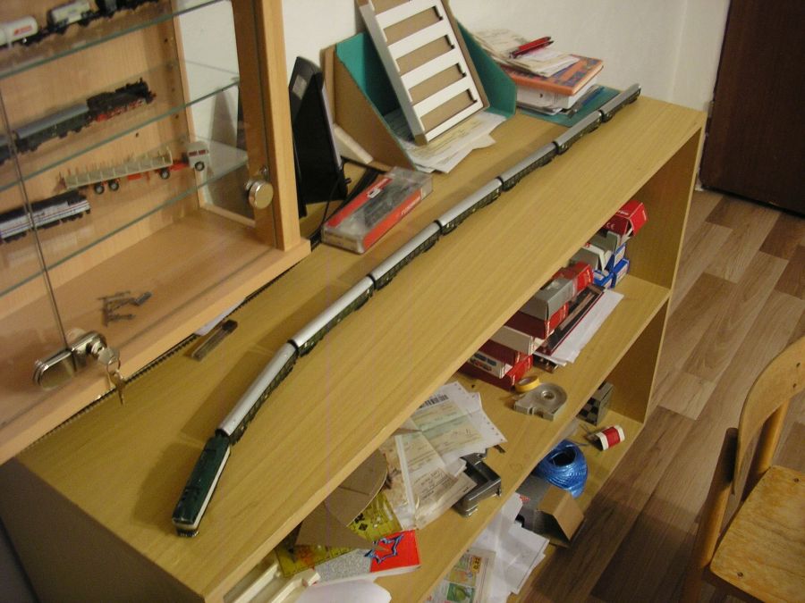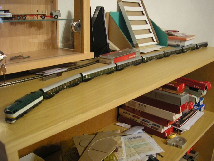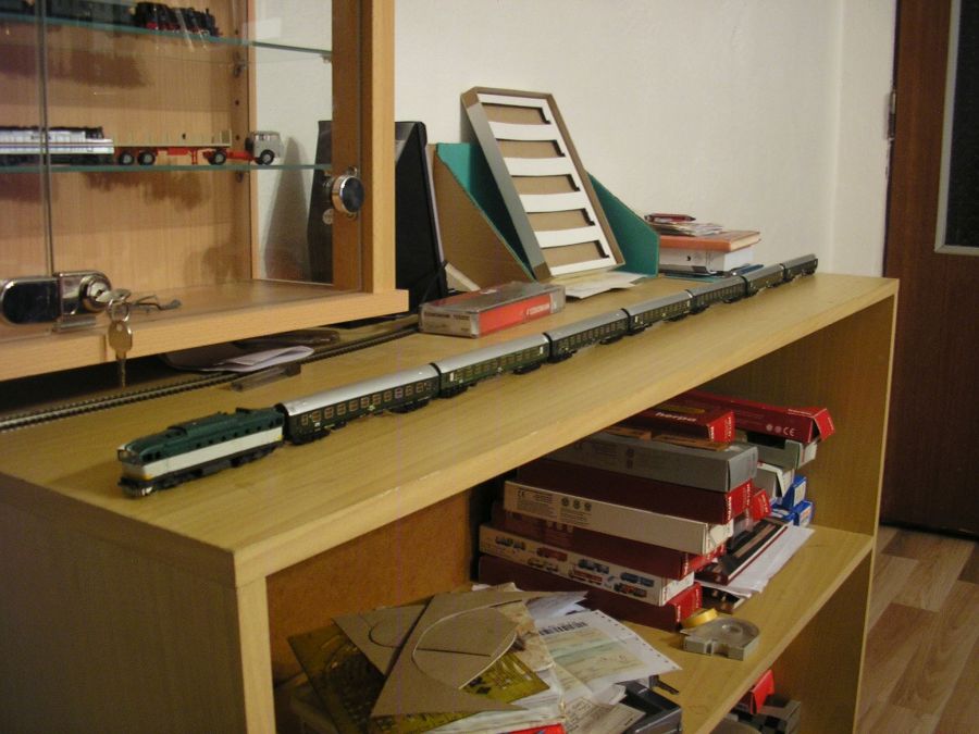 Ahojte,dnes nic zo stavby.Pridavam par foto,ako bude vypadat moj rychlik Horehronec.Pravda,budu v nom zmeny,namiesto jedneho vagonu pribudne restaurak+este jeden,prerobim na BDa.Dlzka supravy takmer 120 cm,okuliarnik je moj da sa povedat prvy model,ktory som postavil,je y odliatku p.Ciza,len ma dorobeny hlavny ram.Posadeny je na pojazde BR 215 Roco.Upozornujem,tento model neni vhodny pre oci pocitacov nitou