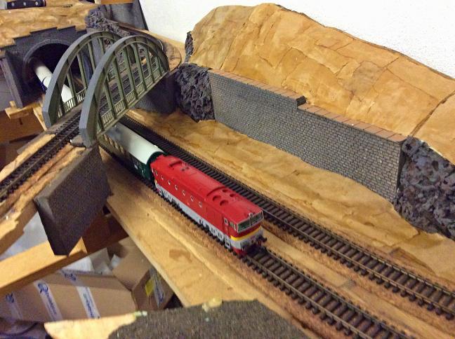Protože jsem volil variantu co nejmenších sklonů na kolejišti, dostal jsem se do situace, kdy některé úseky nejsou nejlépe přístupné. Proto je třeba přístupových otvorů pro nějakou kolizi či čištění. Tohle místo jsem chvíli promýšlel a rozhodl se pro tento dřevěný vyjímatelný blok s opěrnou stěnou. Hrubé zpracování na následujícíc fotografiích i s povytažením.