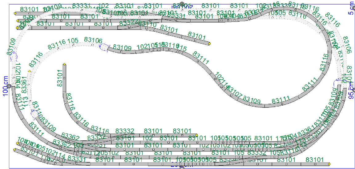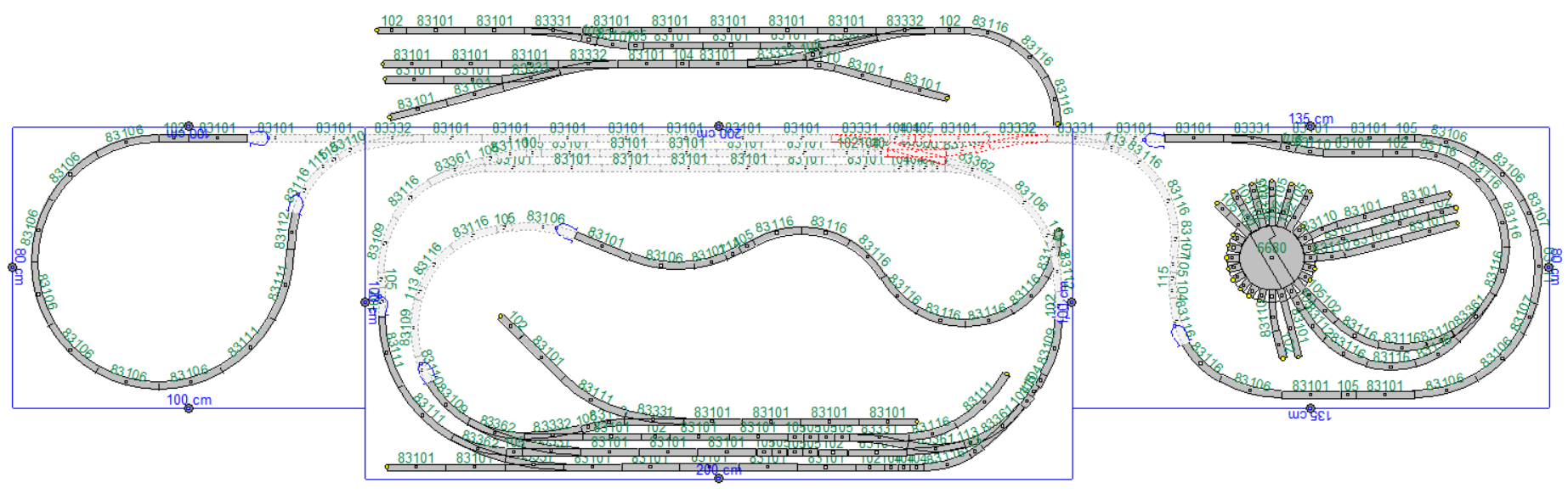 Přetunelováno. Tunel bych nechal jen na spodním okruhu.Místo té spojky prostředkem bych vedl esíčkem širou trať a z horního nádraží udělal koncové. Na kroužení stačí spodní okruh v tunelu. Výhybna vedená doprostřed kolejiště je nešikovná pro manipulaci uvnitř - výhodnější je mít ji u kraje.