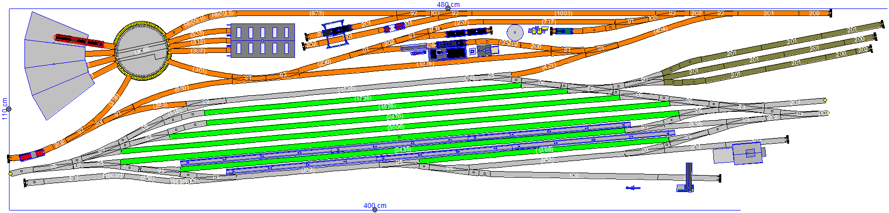 Jinak tady mám zapracované vaše postřehy. To zbrojení páry je dlouhé 1m a dalo by se natáhnout až na 1,2m. Ta stanice jako celek je dlouhá 480cm a je dostupná z obou delších stran. Proto kulisy nepřipadají moc do úvahy. Ty vložené budovy tam jsou zatím jen na zkoušku, to ještě budu muset promyslet a uspořádat, jen jsem zkoušel prostor.