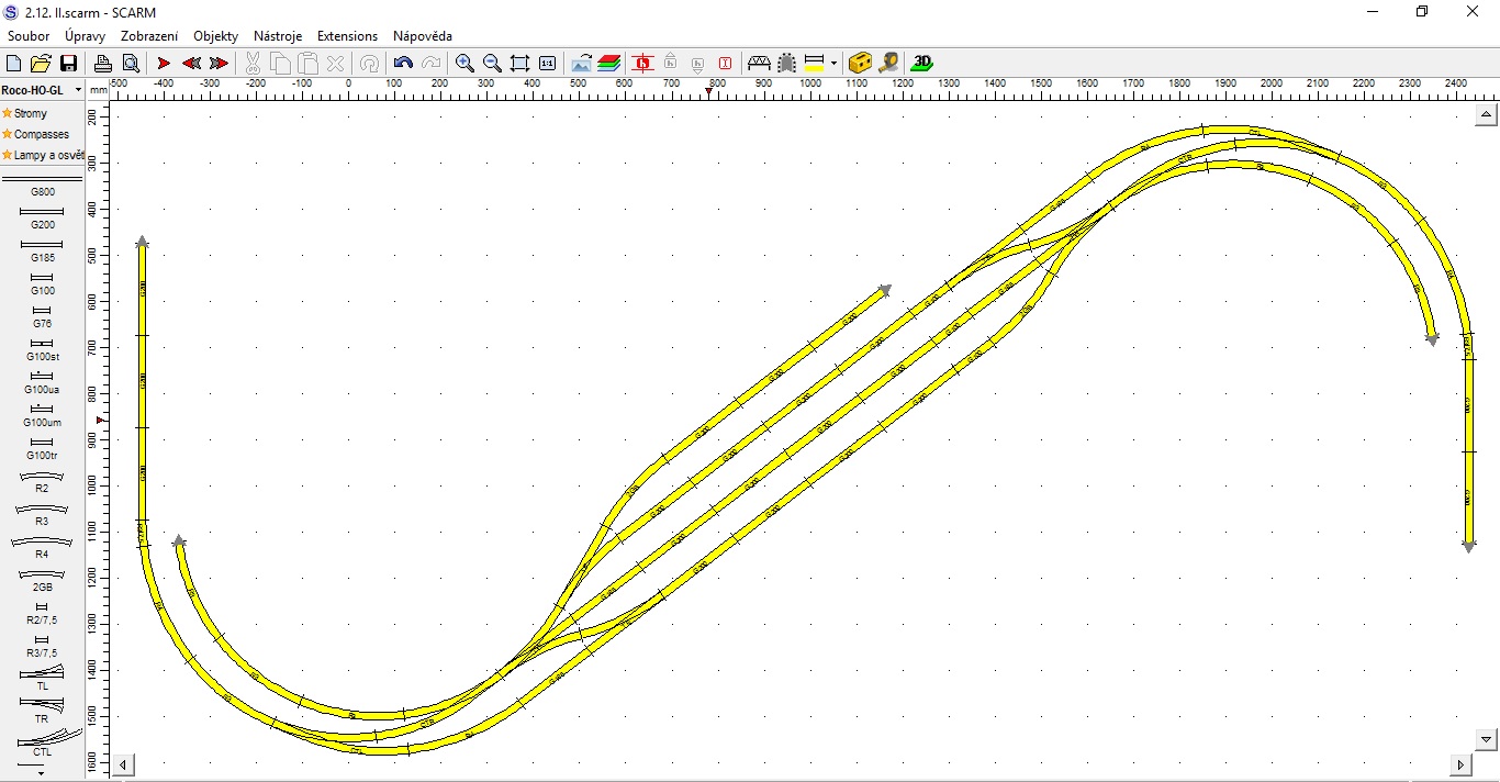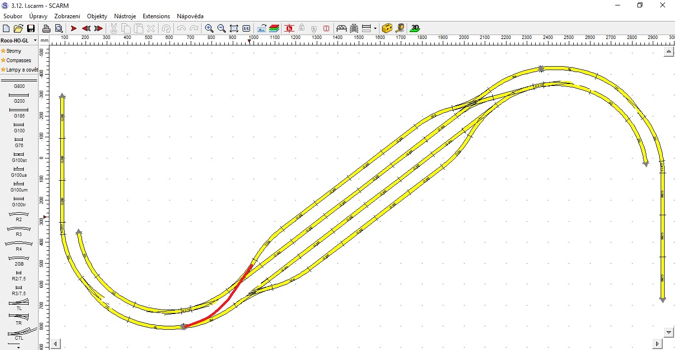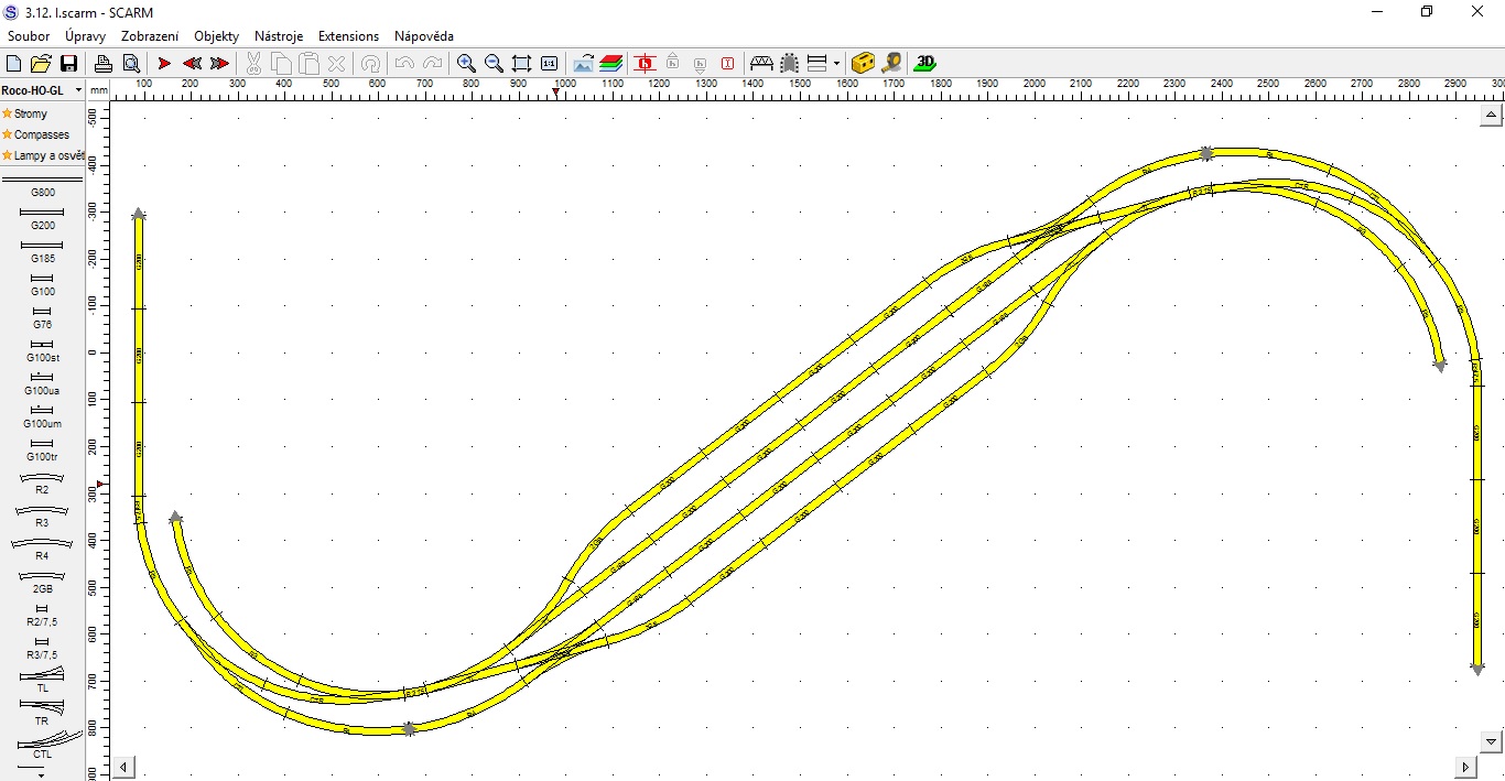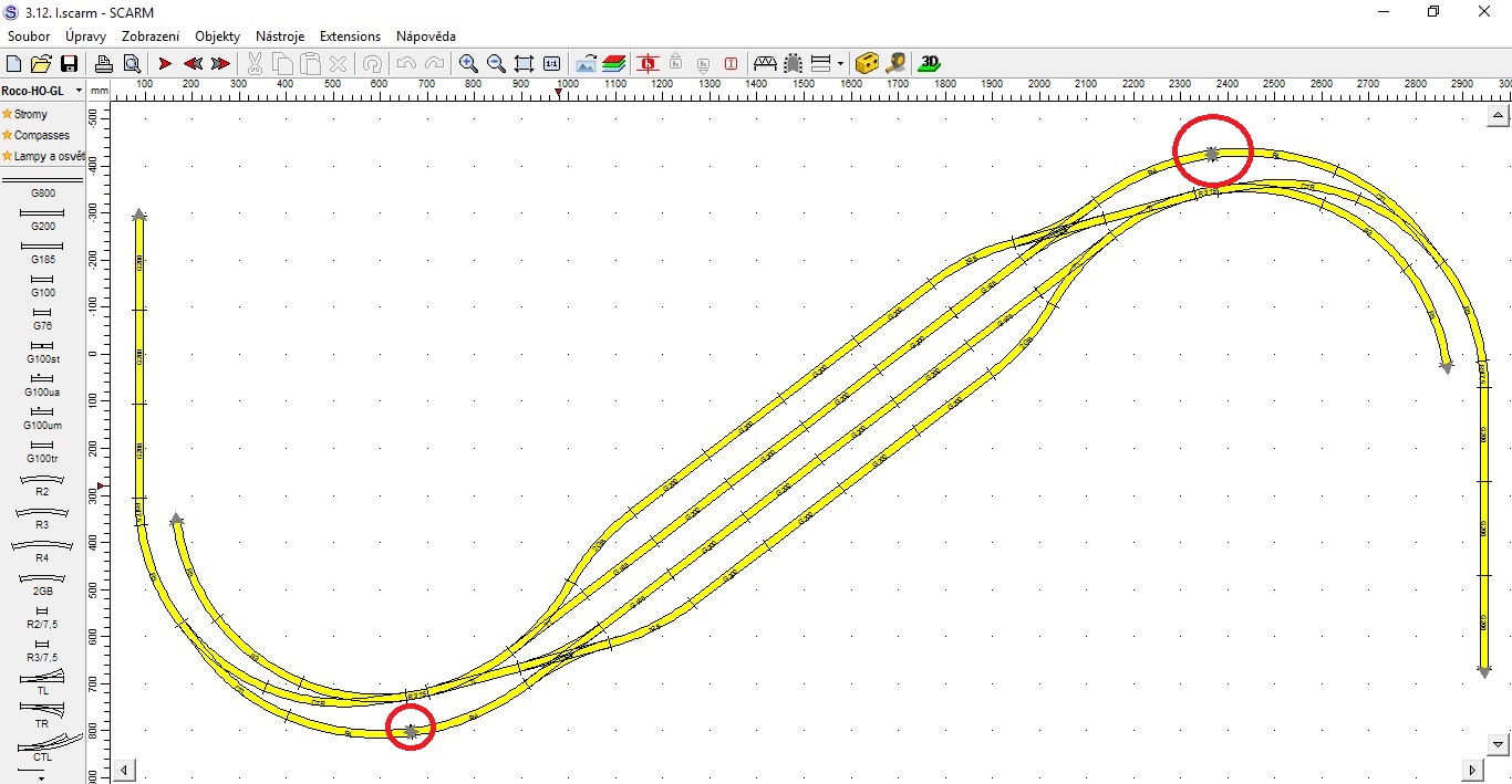 Zaústění hlavní a vedlejší trati přes “krček” taky nepovažuji za ideální. Proto jsem taky měl ve svém prvním návrhu podobné řešení, jako u Velvar. Jen bohužel vše v oblouku, protože jinak bych se prostorově nevešel.