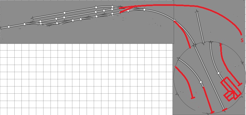 Nad točnou je znázorněn kus širé trati mizející do skryťáku. Skryté by se muselo udělat nad, pod - s tím že by i kolej na točnu stoupala/klesala, nebo by se točna udělala opravdu segmentová a seřízla by se, aby se za ni vešel ještě šuplíkový skryťák na tři koleje (pohyblivá příjezdní kolej). Leč spíše bych asi preferoval mimo úrovňové řešení. Námět je jen ideový, s geometrií jsem si příliš hlavu nelámal... Jak jinak :D V neposlední řadě bych se nevzdával. Toto kolejiště má docela zajímavý potenciál, tak držím palce k realizaci (bez ohledu na zvolenou variantu).