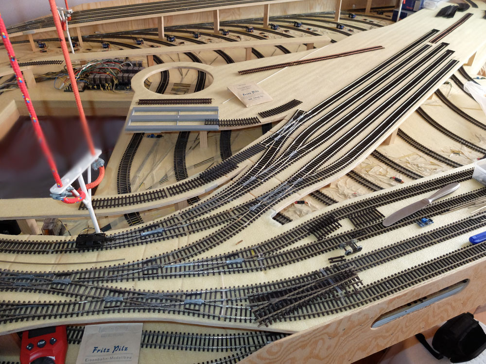 O výšce SN už jsem se vyjádřil a už s tím nic nenadělám. Pod překližkou pod výhybkou bowden nebude. Ocelová struna bude těsně pod kolejemi a do bowdenu vleze až na kraji překližky kde sjede níž. Struny pod kolejemi mi už fungují ve skryťáku. Jenže v délkách tak do 15cm. Tak jsou jen tak volně, popřípadě mají "hřebíčkové" vedení. Ani tam jsem přestavníky nemohl dát pod výhybky. Struna pod kolejemi bude v podloží, přelepena a zaštěrkovaná.