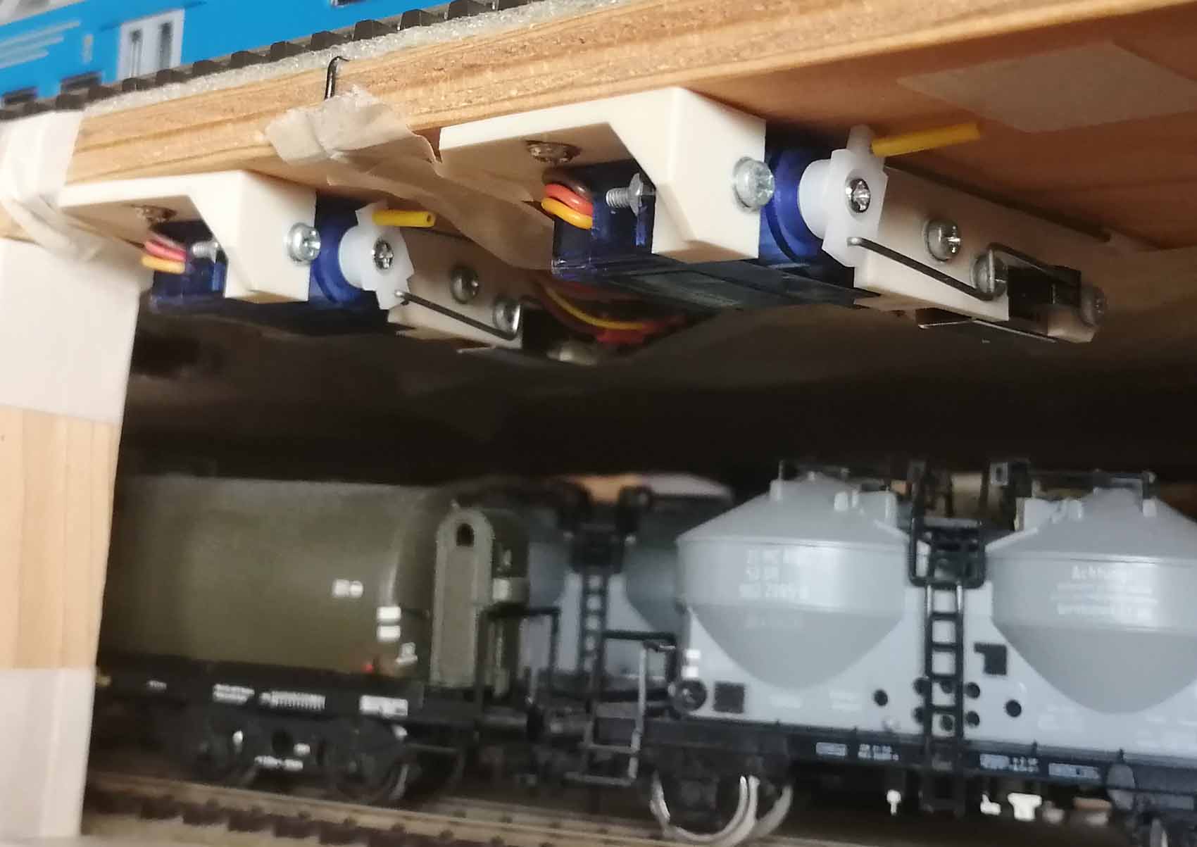 Vzhledem k nízkému profilu pod kolejemi, musím mít taky přestavníky, co nejnižší. Používám čínská serva. Mají naplacato 12mm, a nad tenhle rozměr jsem nešel. Navrhnul a vytiskl jsem si vlastní držáky. Součástí je taky dvoupólový přepínač. Pro zpětnou informaci o přehození a pro napájení srdcovky.