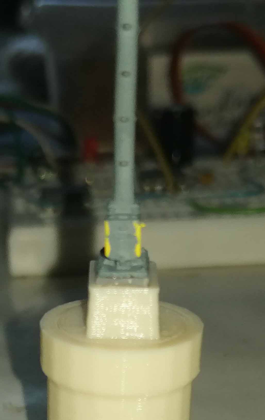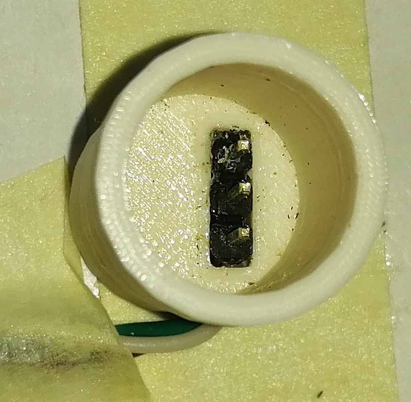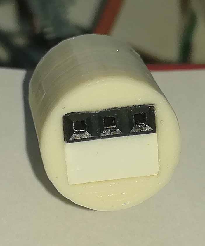 Uvnitř jsou piny konektoru, do kterého se zasunou dutinky ze spodku návěstidla. 3 drátky vystupují spodem a do boku, aby o ně vagony nezachytávaly. Je to + - 5V a signál S-COM.
