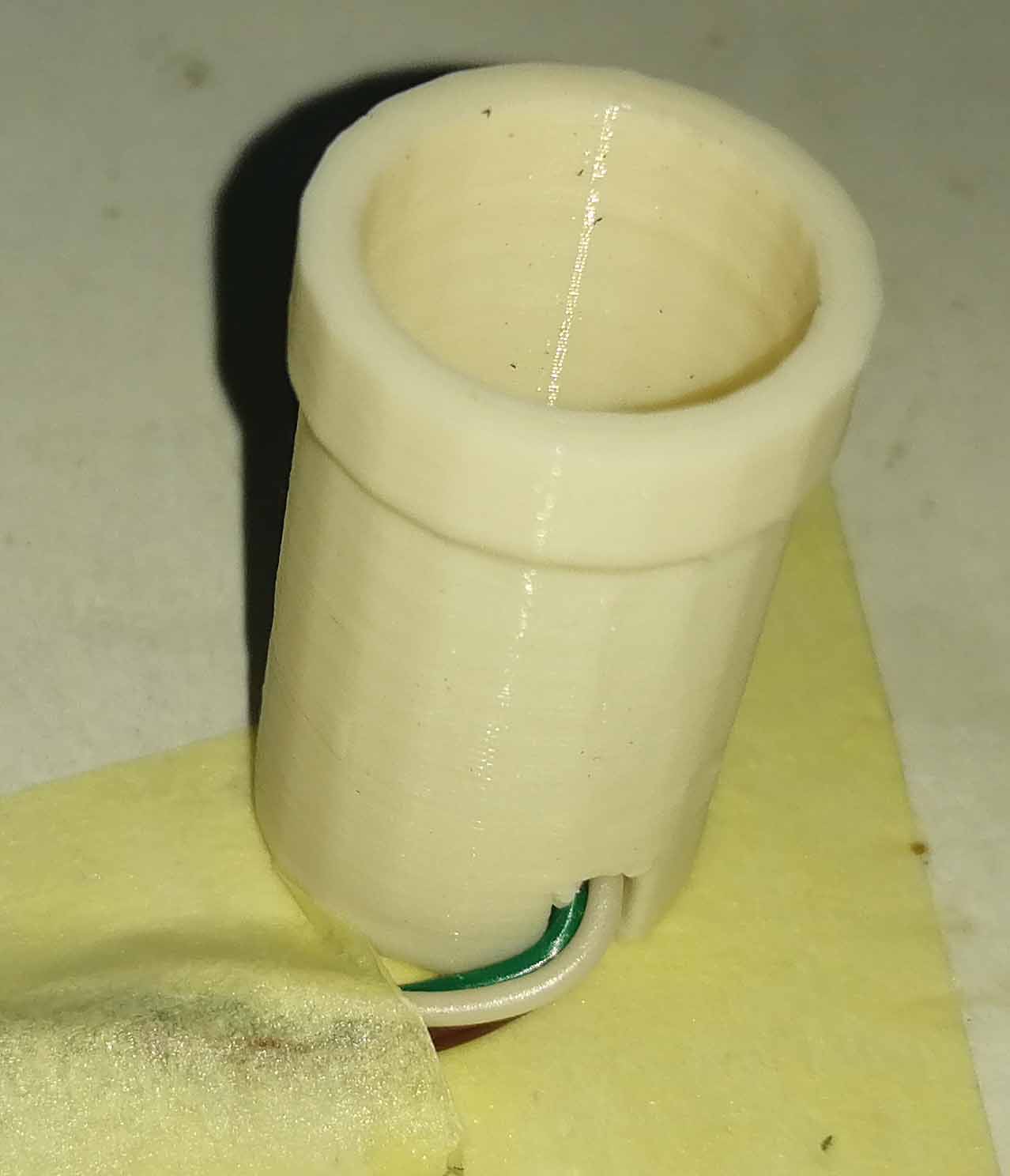 Samotná šachta vypadá takhle. Do desky kolejiště vyvrtám díru 14mm, a šachtu zasunu a zalepím, po ten lem. Vyčnívat nad desku má asi 4mm. Překližku mám 8mm, a pod desku to zasahuje 11mm. Přestavníky mají 12. Takže vagonům ve SN, návěstidla nahoře vadit nebudou.