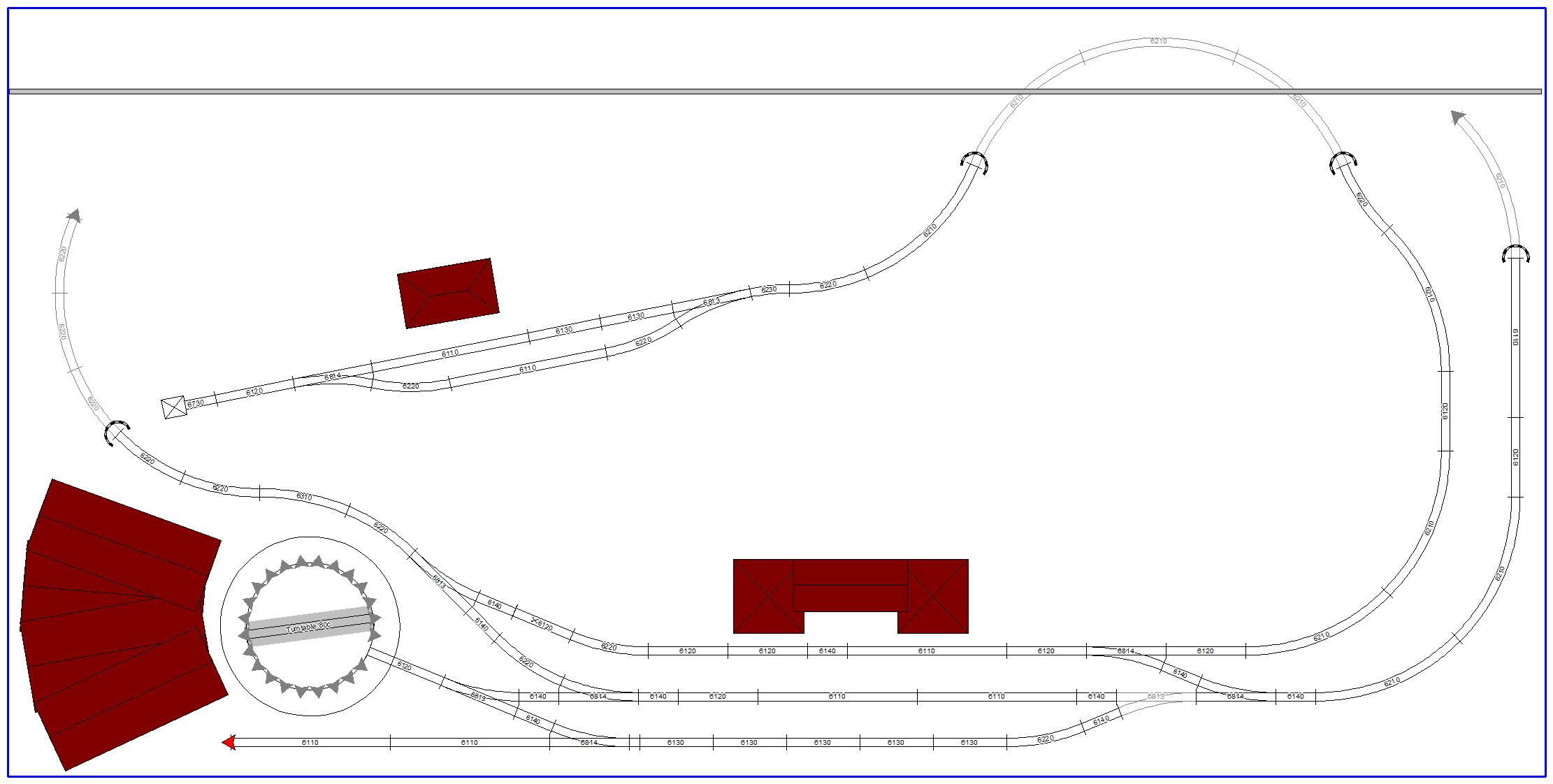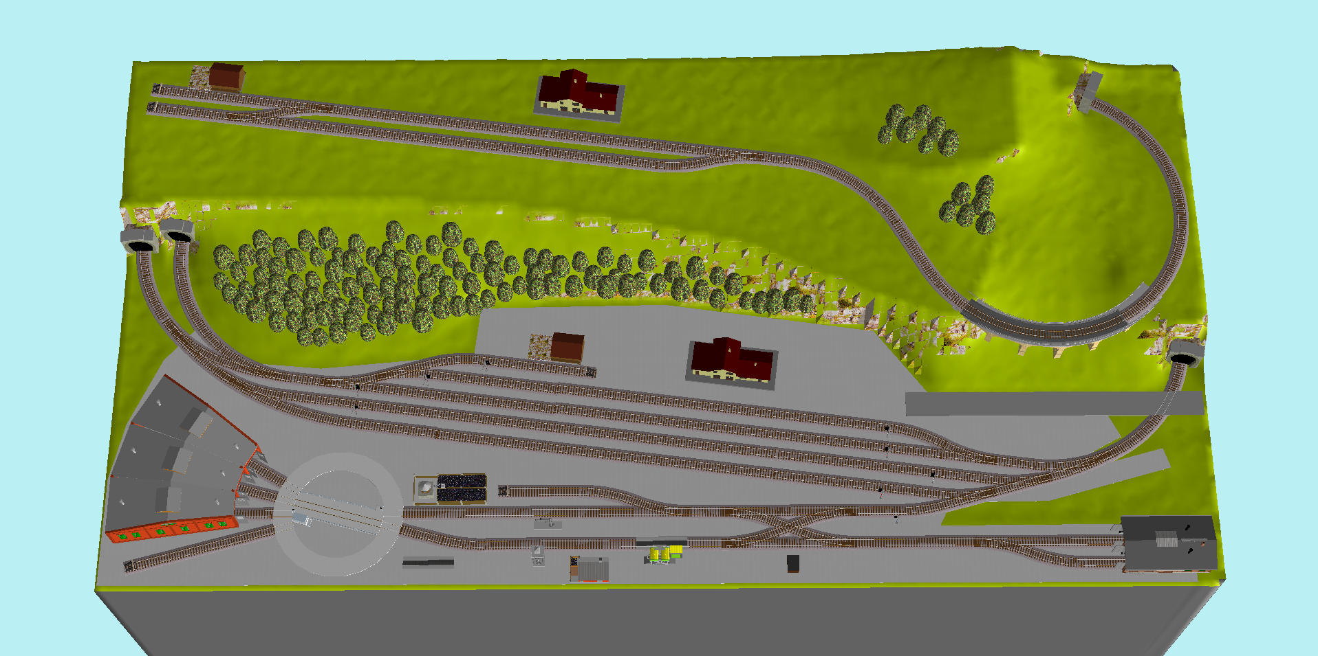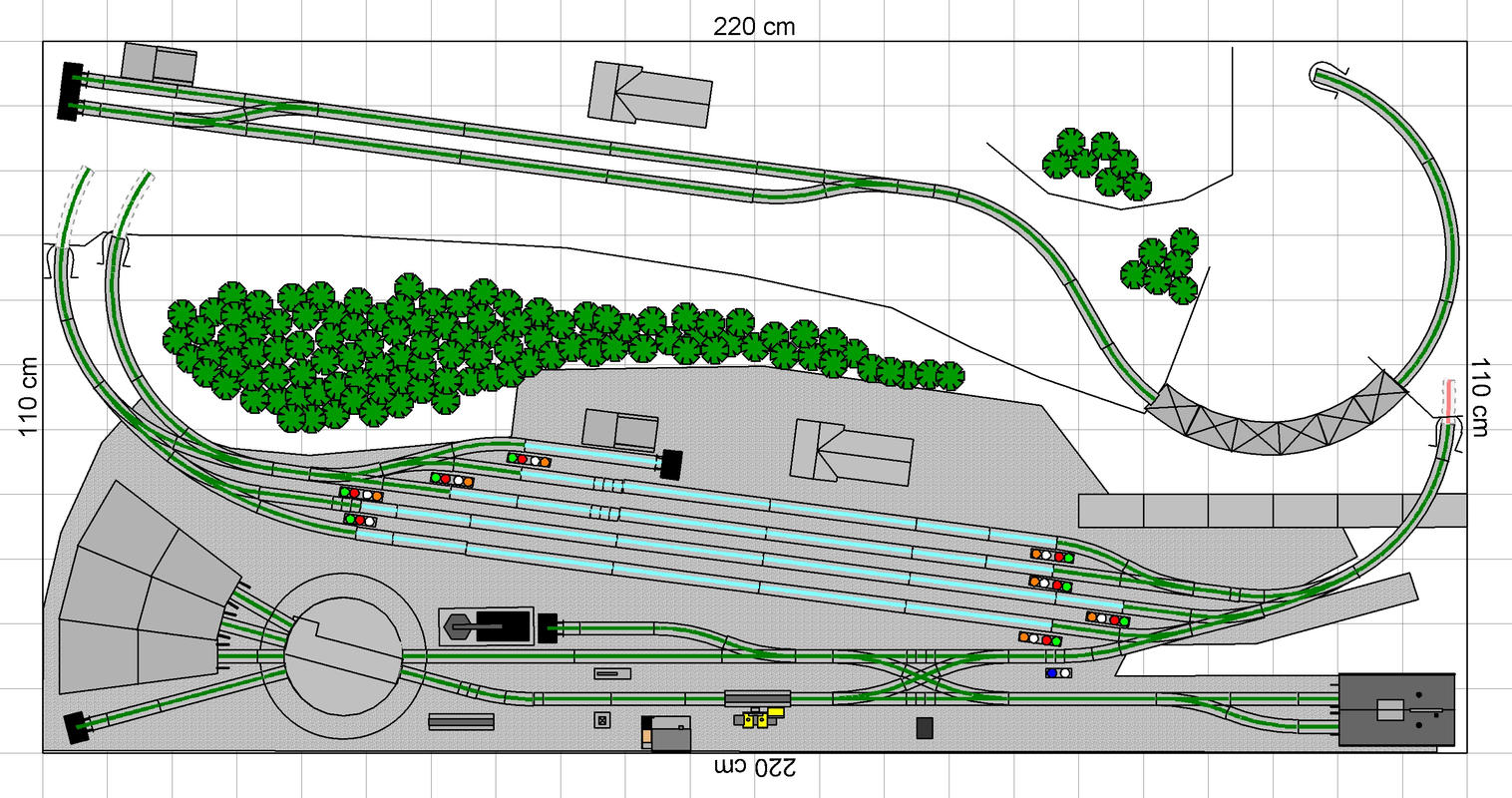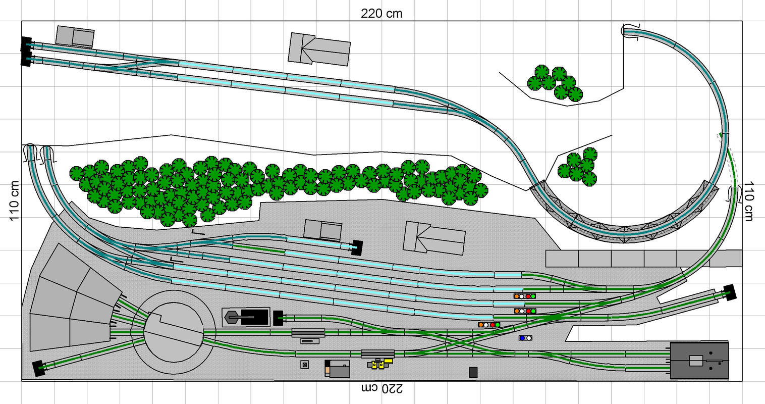 Levá strana lokomotivního depa není zatím dokončena.Taktéž chybí figura kolejiště přípojné stanici,vedení lokální tratě s koncovou stanici.Dvojkolejná trať napravo mizí v tunelu (není zakreslen).