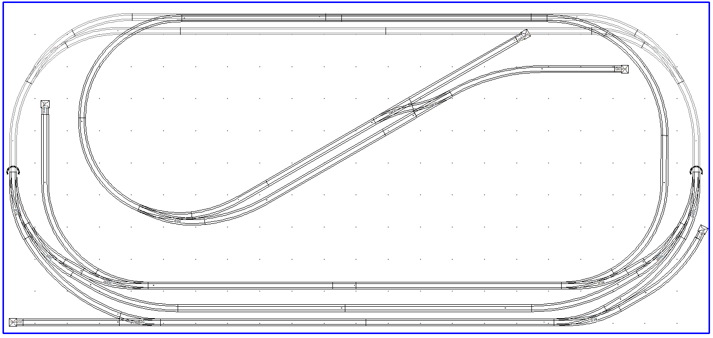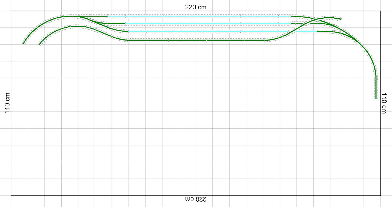 Na dvojkolejné tratí je napojena místní přípojná stanice (není nakreslena).Přemýšlel jsem jak dostat zpět ze skryťáku na lokálku nákladní zátěž.Navrhl jsem tento obrat.
