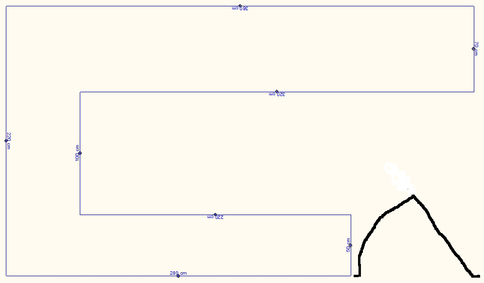 Rozmer miestnosti je totožný s vonkajším obrysom rámu. Dvere sú vpravo dole - vedľa spodného ramena celého toho U-čka.