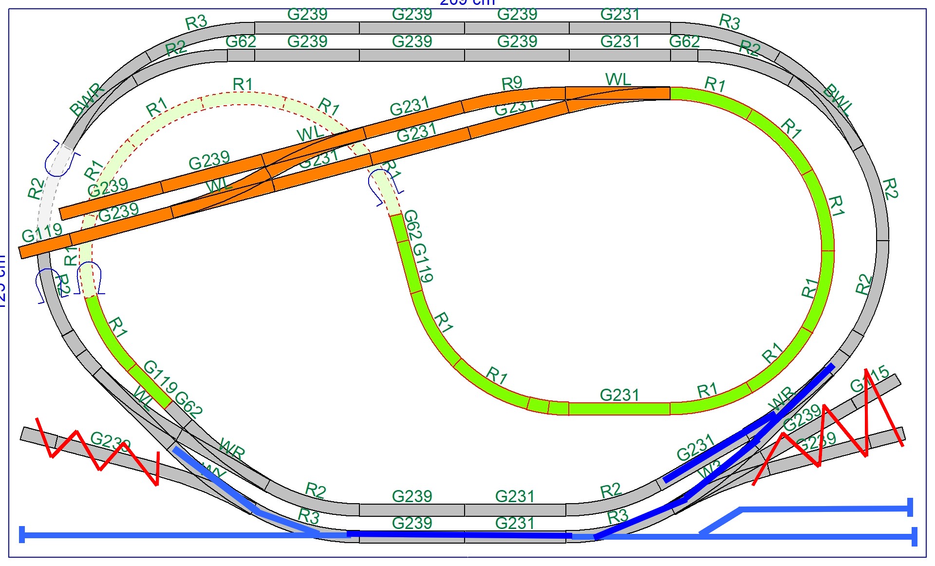 To zadní nádraží by klidně mohlo být skryté. Jednak i takhle na něj moc neuvidíš, jednak při hloubce 125cm tam toho v případě maléru stejně moc nevylovíš a stejně budeš odsunovat celý stůl. Pak by bylo možné posunout koncovou stanici kousek dozadu a případně ji dát víc šikmo, aby se trochu prodloužily staniční koleje. Taky by pomohlo kousek doleva posunout tu dvojici výhybek, taky to přidá aspoň kousek dělky staničních kolejí.