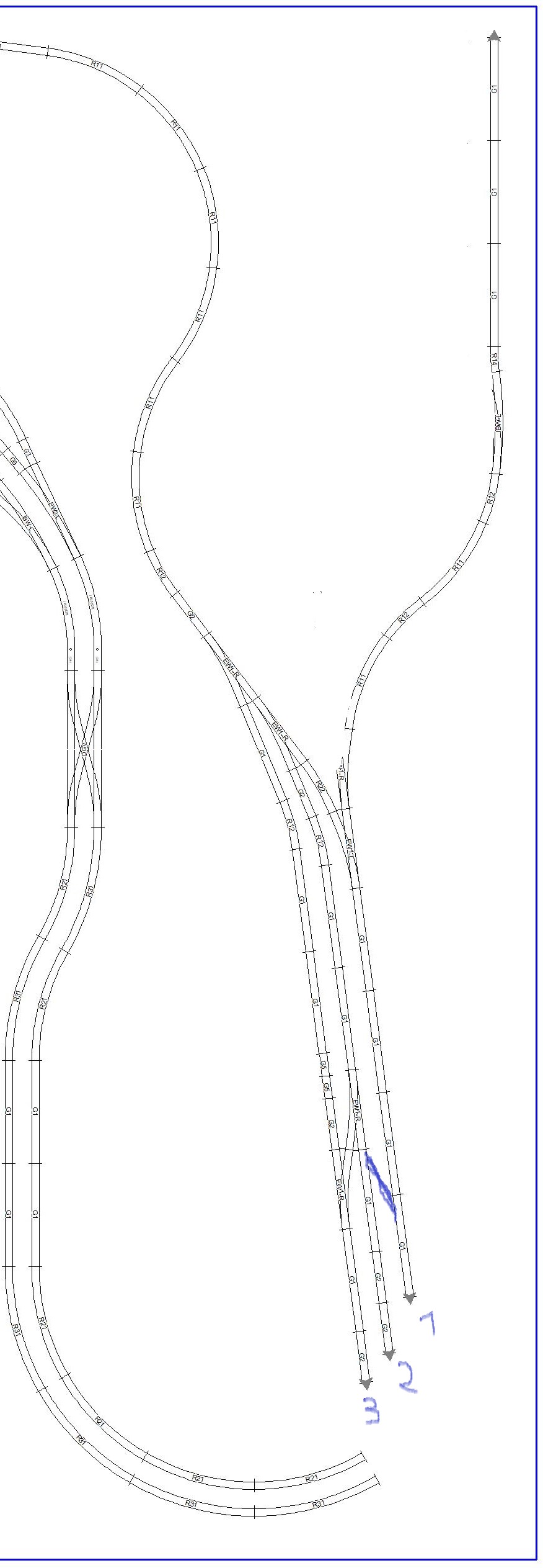 Ne, ty dvě co máš vyměníš za ty použité mezi 2 a 3 a ty odtamtud dáš mezi 1 a 2. Tím se dostaneš ze všech tří kolejí na kusou v prodloužení 2 koleje. Ten kousek kusé na koleji 2 bude tak dlouhý, aby se na něj vešla nejdelší loko, která bude do stanice zajíždět a bude zde objíždět soupravu. Jinak na ní nebude nic stát. No a ty dvě ostatní pak jak to vyjde, jedna může být pro odstavení osobního vozu ze soupravy mimo špičku (spíše ta u staniční budovy) a druhá pak u nakládkové plochy či rampy skladiště, možná i pro traťovku, ale tady nejsem odborníkem.