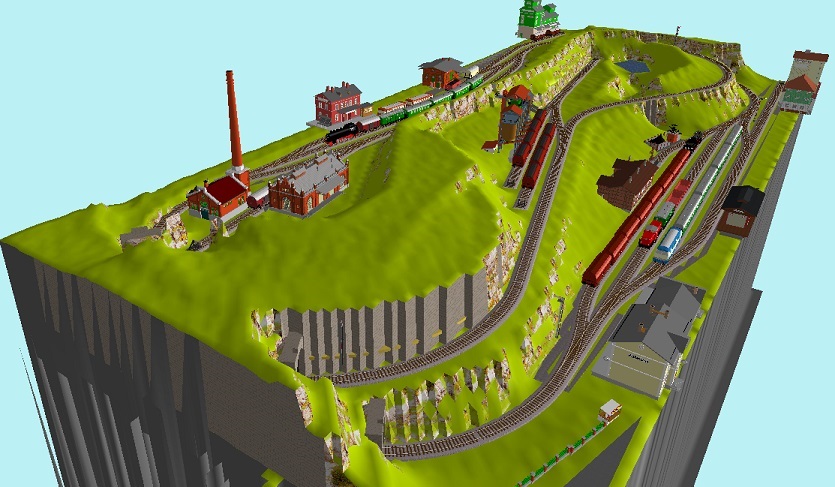 V plánku není doplněná vegetace, ani detaily. Železniční vozidla jsou především kvůli znázornění délek kolejí.
