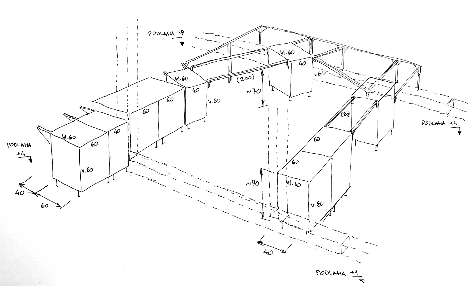 hliníkových profilů příčky. Profily jsou v různých sílách a dají se kombinovat. Na takto vzniklou rovinu se naskládají segmenty dolního patra.