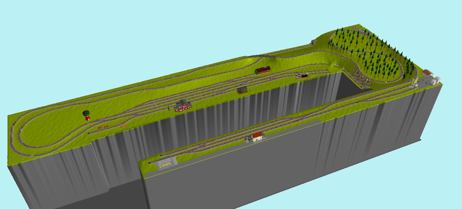 Z dolní stanice jdou doleva obě tratě napřed souběhem (tady to ještě chce rozvolnit poloměry!), lokálka se začne zvedat a lehce se odělí - za ní by měl terén ke kraji kolejiště dál stoupat.